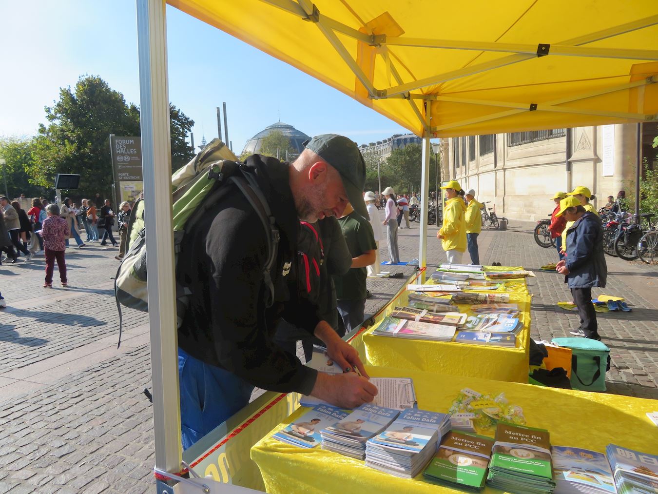 十月七日,法轮功学员在巴黎美丽城进行了弘法和讲真相的活动。这里华人和中国人聚集,这天正好有集市,很多人前来了解真相,并想要学炼法轮功,索要巴黎炼功点的地址。