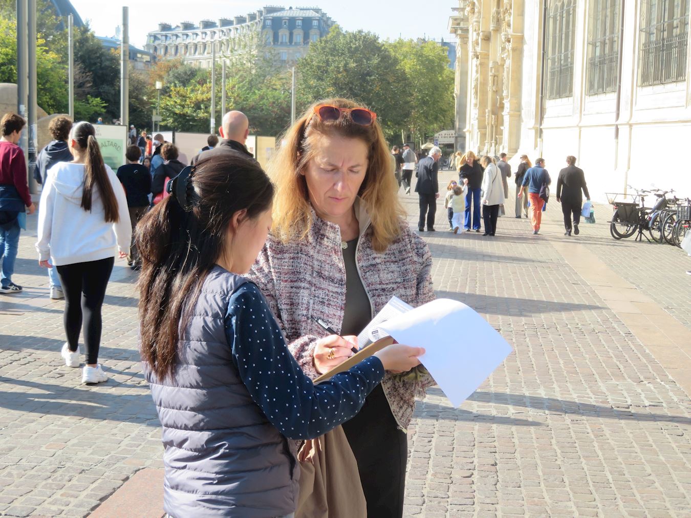 十月十一日在夏特莱街区,在祥和的法轮功炼功音乐声中,法轮功学员的功法演示,吸引了众人观看。很多人都想学炼法轮功,他们记下了巴黎炼功点的地址。醒目的横幅和展板,吸引了人们的注意力。人们了解法轮功真相和中共活摘罪行后,非常震惊和愤慨,在反迫害征签表上签名,希望早日停止迫害。