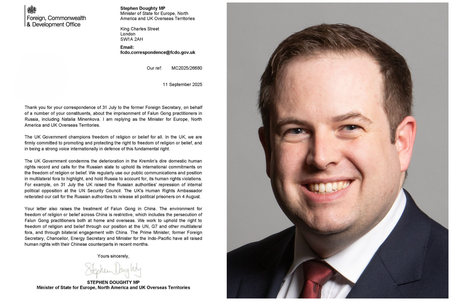 英国负责欧洲、北美及英国海外领土的国务大臣斯蒂芬·道蒂(Stephen Doughty)议员在信中表示:“英国政府一贯倡导人人享有宗教或信仰自由。在英国,我们坚定致力于促进和保护宗教或信仰自由的权利,并在国际上为这一基本权利发出强有力的声音。”