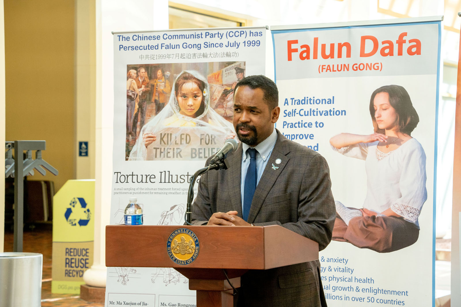 ![]() 图3:在宾州议会大厦举行的法轮大法真相日新闻发布会上,宾州参议员斯特里特谴责中共迫害法轮功。 |