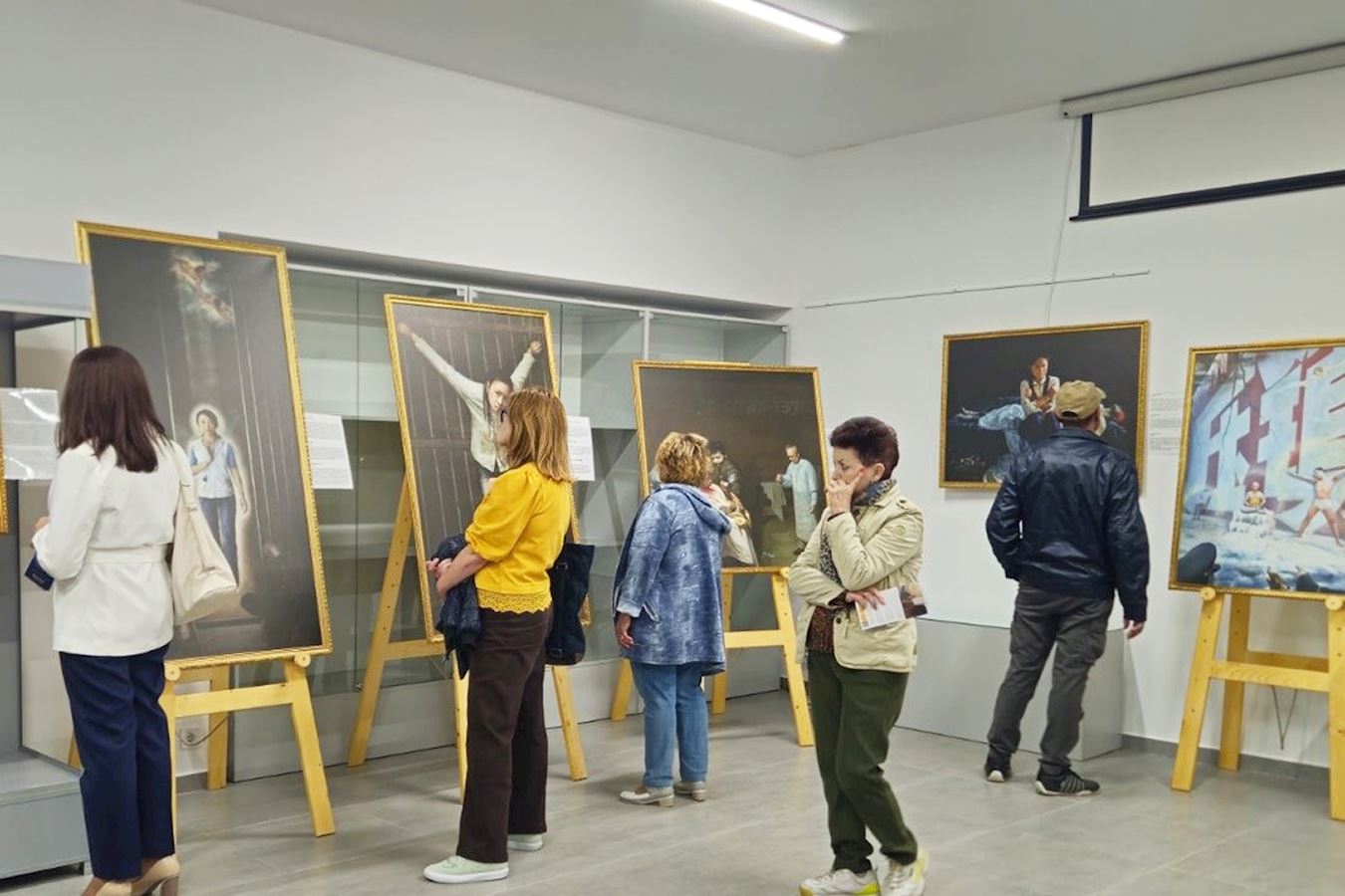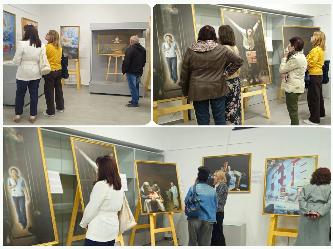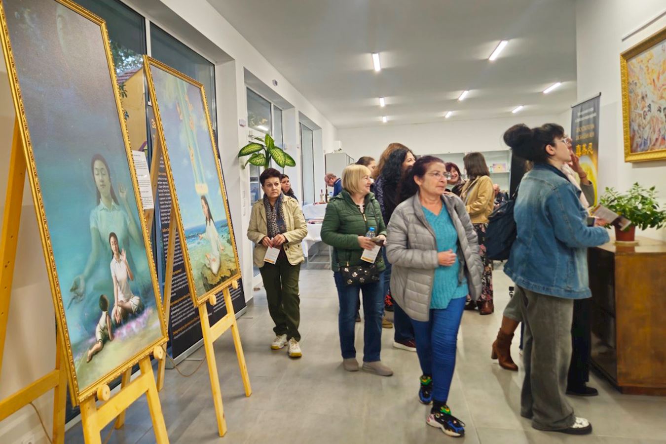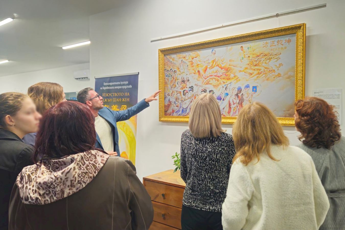 来自斯塔拉·扎戈拉(Stara Zagora)的法轮大法学员欢迎前来参观画展的斯维林格勒居民,向他们介绍展览的缘起、主题,以及画作所传达的信息。