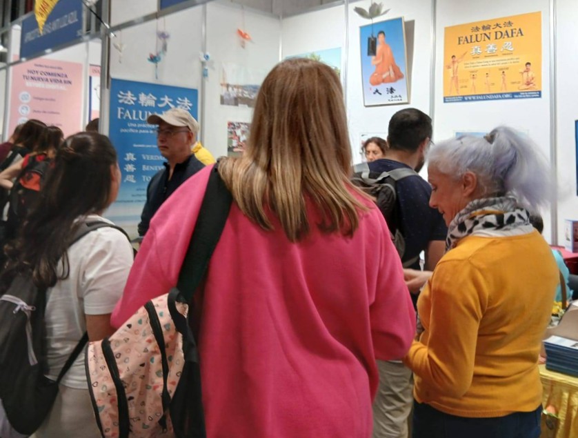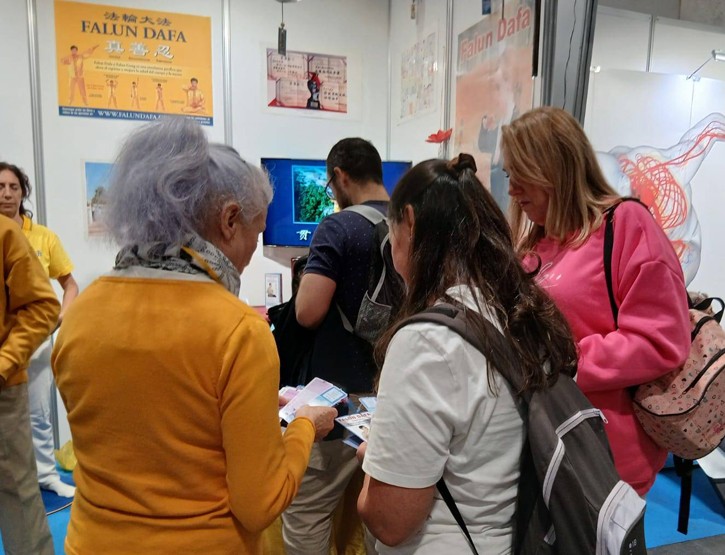 以法轮大法创始人李洪志师父的法像以及法轮大法在全世界弘传盛况的海报为背景的法轮大法展位里,电视屏幕上循环播放着法轮大法创始人李洪志师父的教功录像,法轮功学员伴随着祥和的音乐展示着舒缓优美的法轮功五套功法,慈悲纯正的能量场吸引了众多的参观者驻足观看、咨询、领取资料、购买法轮大法书籍,聆听法轮功学员们讲述的修炼故事和心得体会,也有参观者当场学炼法轮功的五套功法,亲身体验和感受大法的超常与美好。