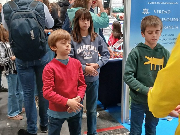 一位中年女士带着她的四个孩子来到展台前,孩子们被法轮功学员展示功法的优美动作所吸引。他们目不转睛的在展台前足足站立了十几分钟,之后,除最小的孩子年龄尚小需要妈妈照看外,其他三个孩子主动要求学炼了动功。孩子的妈妈用手机拍下了他们学功的视频,记录下这一美好瞬间。临别时女士告诉学员:有缘结识法轮功,是我和孩子们这次博览会之行最有意义的一件事。当听说每周日在各地炼功点都有义务教功后,她仔细询问并记下了详细时间和地点并一再感谢法轮功学员。