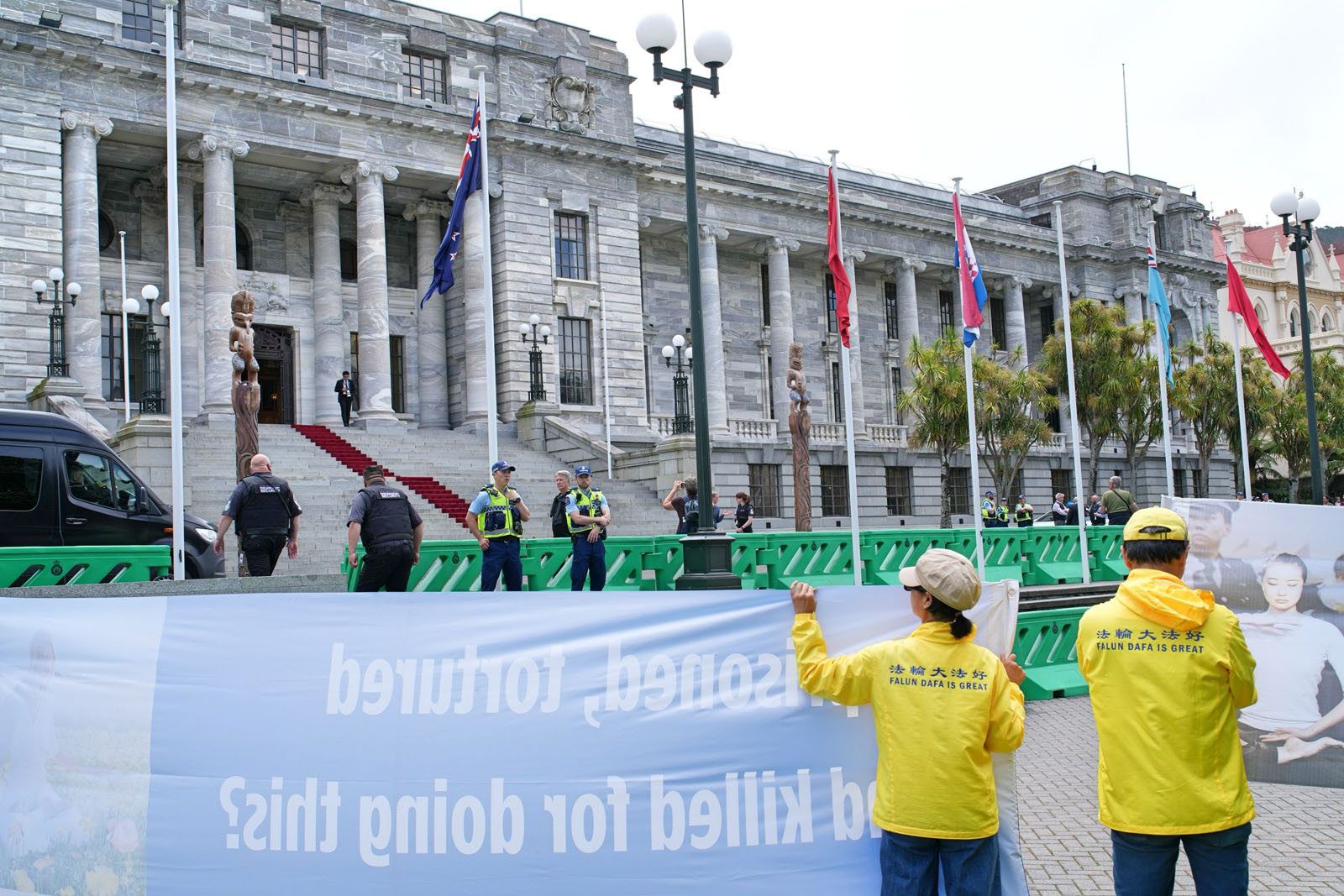 图1~4:二零二五年十一月二十日,中共人大委员长赵乐际到达新西兰首都惠灵顿国会,法轮功学员在国会前抗议,要求中共停止迫害法轮功。