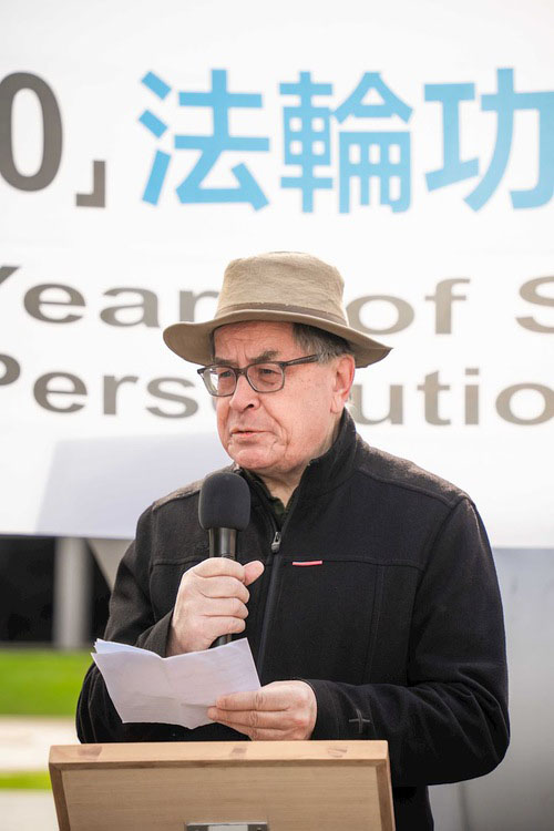 图6:安东尼·布朗特(Antony Brunt)在二零二三年七月十五日,法轮功学员反迫害集会上的演讲照片。