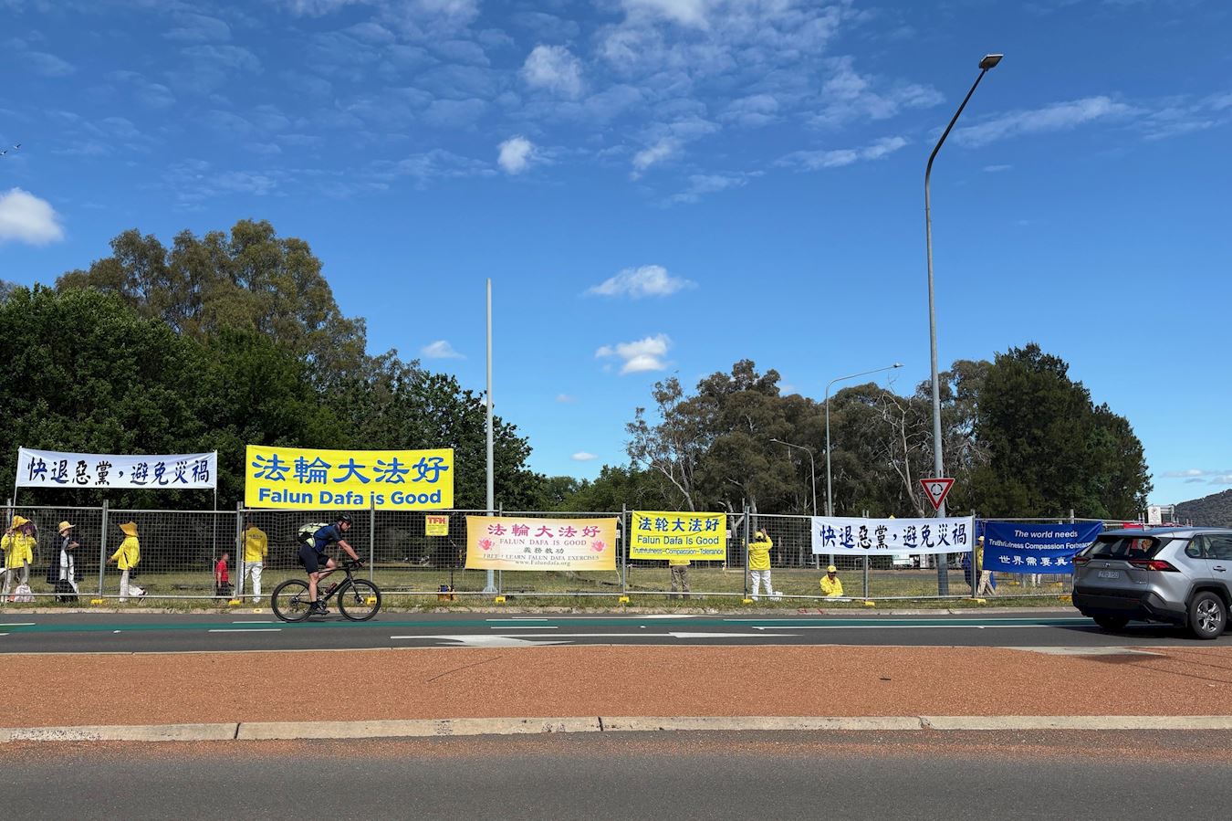 '图17~18:二零二五年十一月二十五日清晨开始,在堪培拉中领馆附近街道,法轮功学员展示真相橫幅。'