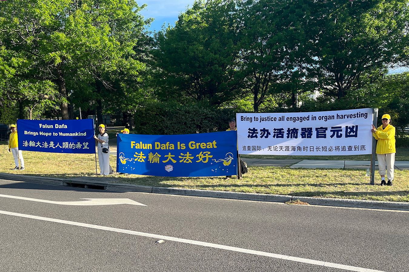 赵乐际一行车队两次经过法轮功学员的和平抗议队伍,看到真相横幅,听到“法轮大法好”、“停止迫害法轮功”的呼喊。