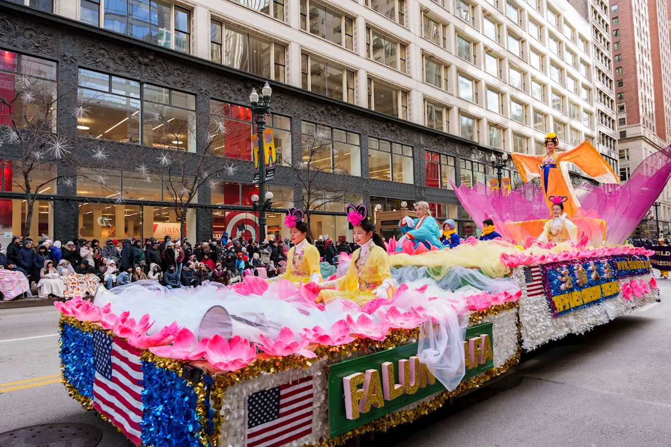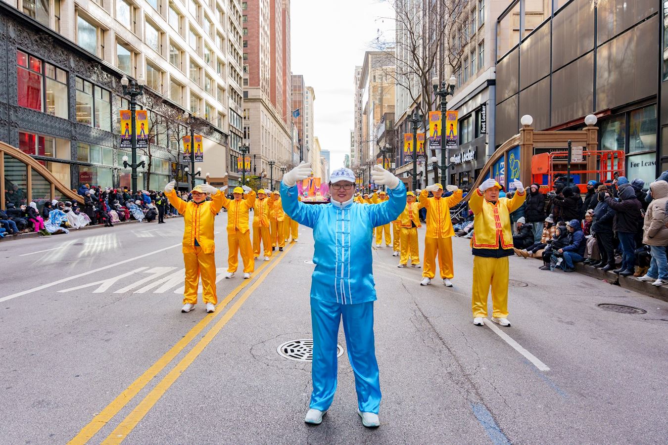 大芝加哥地区的法轮功学员今年是连续第二十二年参加该游行,学员们以庄重的旗阵、祥和的炼功方阵和壮观的大莲花花车吸引了现场观众,许多观众模仿学炼功法动作,沿途观众掌声、喝彩不断。