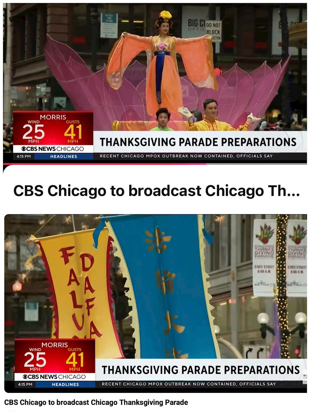 ![]() 图8:CBS电视台34秒的芝加哥感恩节游行预告片中,以二零二四年法轮大法游行的精彩片段作为亮点。(网络截图并合成) |