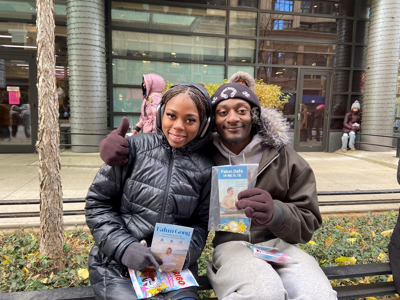 芝加哥居民戈麦斯(Gomez)和太太盖比(Gaby)表示他们很高兴在这次游行中了解到法轮大法。虽然这是他们第一次得到法轮大法的信息,盖比说:“我很想更多了解这个功法。” 看到法轮功的花车时盖比也非常兴奋。她对法轮功学员说说:“花车太赞了!很高兴在这里看到你们。”
