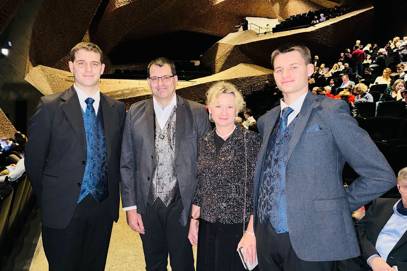 图8:二零二五年十二月二十八日晚,波兰医学专家帕维尔·伯恩特(Paweł Berndt)和太太、肿瘤科专家玛格达莱娜(Magdalena)以及两位医科大学生儿子彼得(Peter, 左一)、克日什托夫(Krzysztof, 右一)一起观赏了神韵演出。(大纪元)