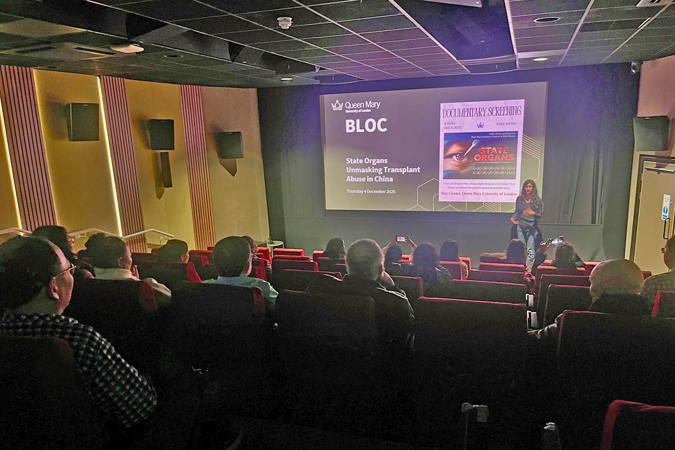 '图1~2:二零二五年十二月四日,揭露中共活摘法轮功学员器官罪行的纪录片《国有器官》在英国伦敦玛丽女王大学(Queen Mary University)放映。'