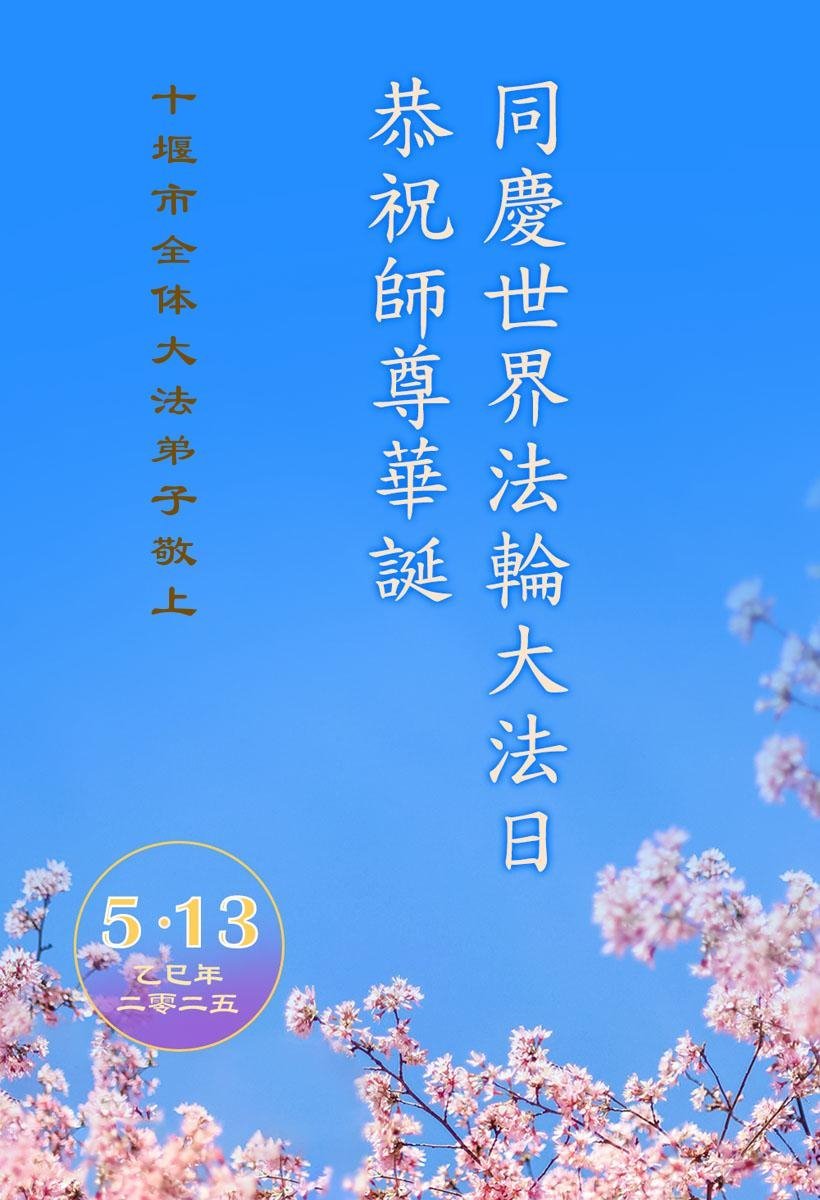 在这普天同庆、人神共贺的神圣日子里,我们十堰市全体大法弟子恭祝法轮大法洪传世界三十三周年!恭贺世界法轮大法日!恭祝慈悲伟大的师尊生日快乐!我们一定牢记师尊的教诲,学好法,修好自己,正念正行,多救众生,完成好大法弟子助师正法的历史使命!
