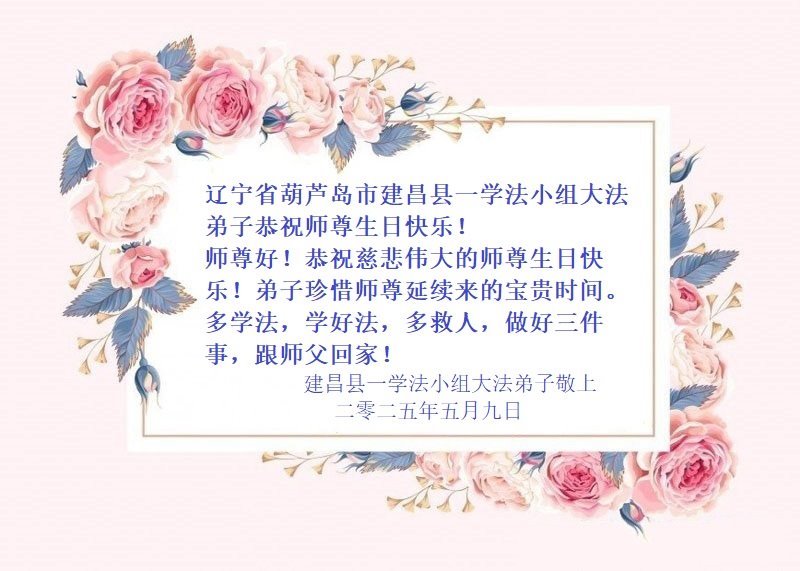 我是老年大法弟子四人学法小组成员之一,在师父的一路保护下走到今天。以后要抓紧时间多救人,以报师恩。叩拜师父,祝师父生日快乐!
