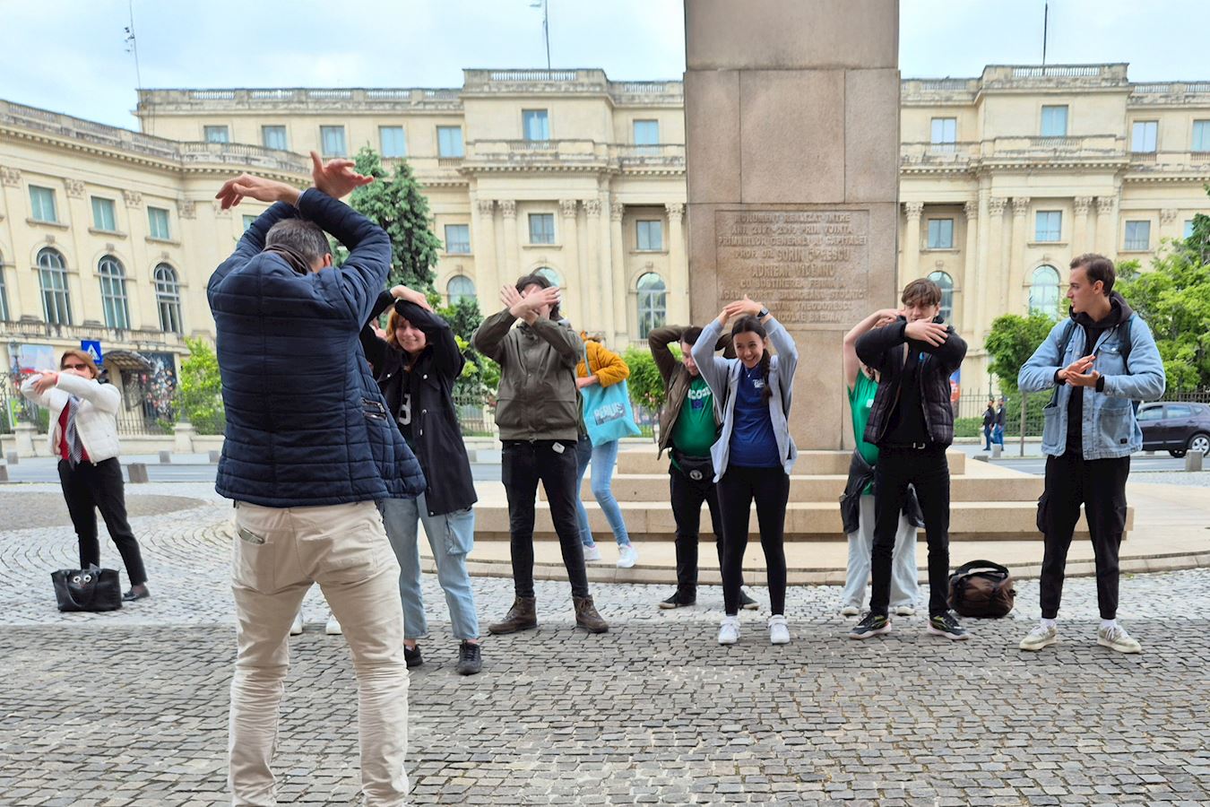 ![]() 图8:五月十二日,在罗马尼亚首都布加勒斯特的胜利大道(Calea Victoriei)举办的信息日活动上,一群年轻人学炼法轮功功法。 |