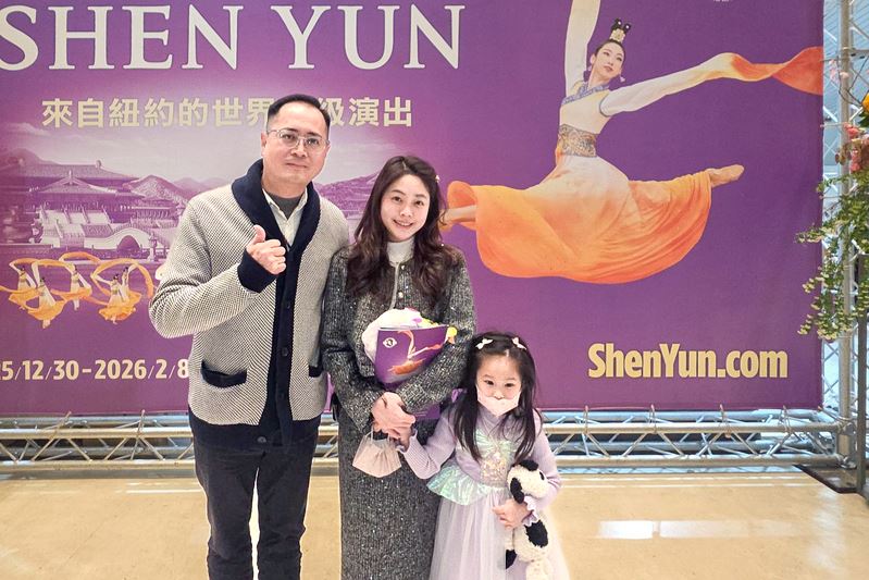 ![]() 图10:二零二六年二月七日晚,海景科技工程总经理袁大雅(左)一家人在台中观赏了神韵演出。(大纪元) |