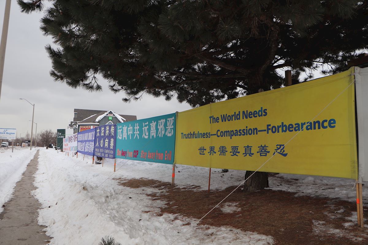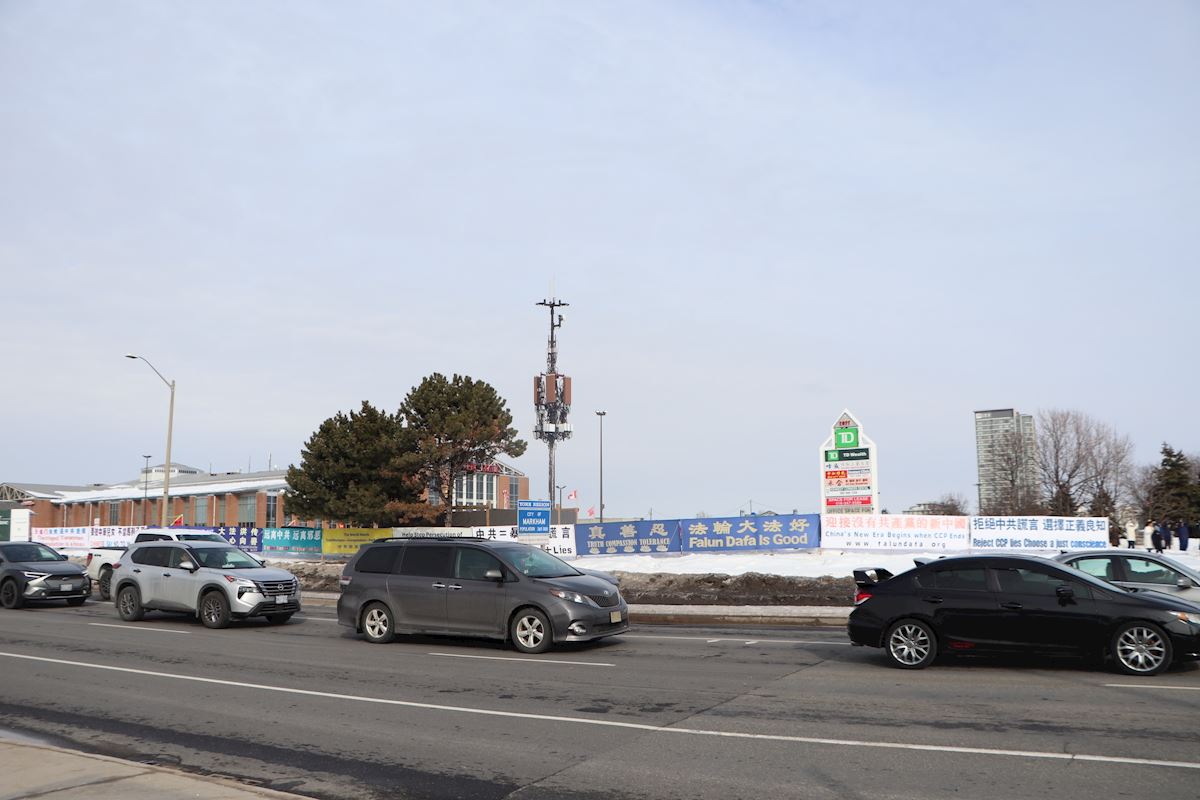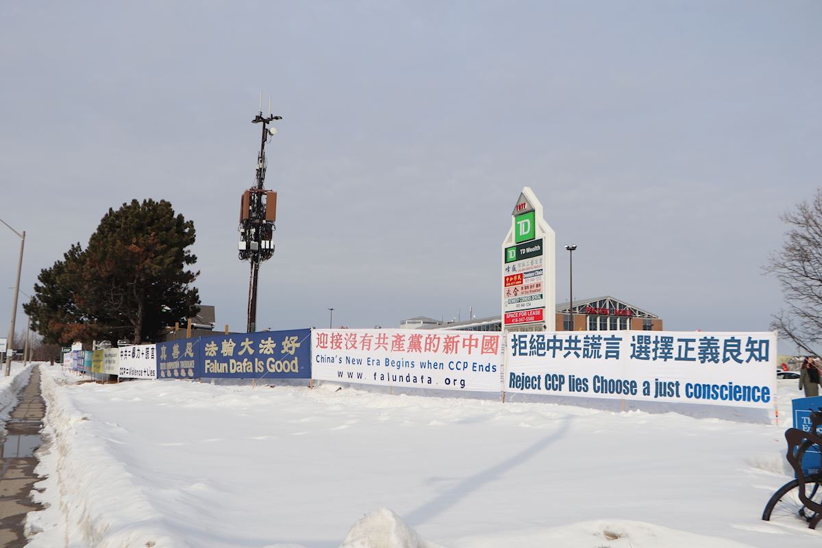 多伦多法轮功学员在广场的十字路口建立的反迫害真相点,他们的横幅让来自四面八方的车流都能看到,经常遇到鸣笛和竖拇指称赞的现象。当地法轮功学员已经坚持了二十多年,不管寒风暴雪,还是烈日暴晒,每天的横幅都是屹立不倒。今年在最寒冷体温感觉零下20多摄氏度的情况下,学员依然一日不落地坚守着在讲真相和劝三退,每天的劝三退人数多则几十人,少的也有十几人。