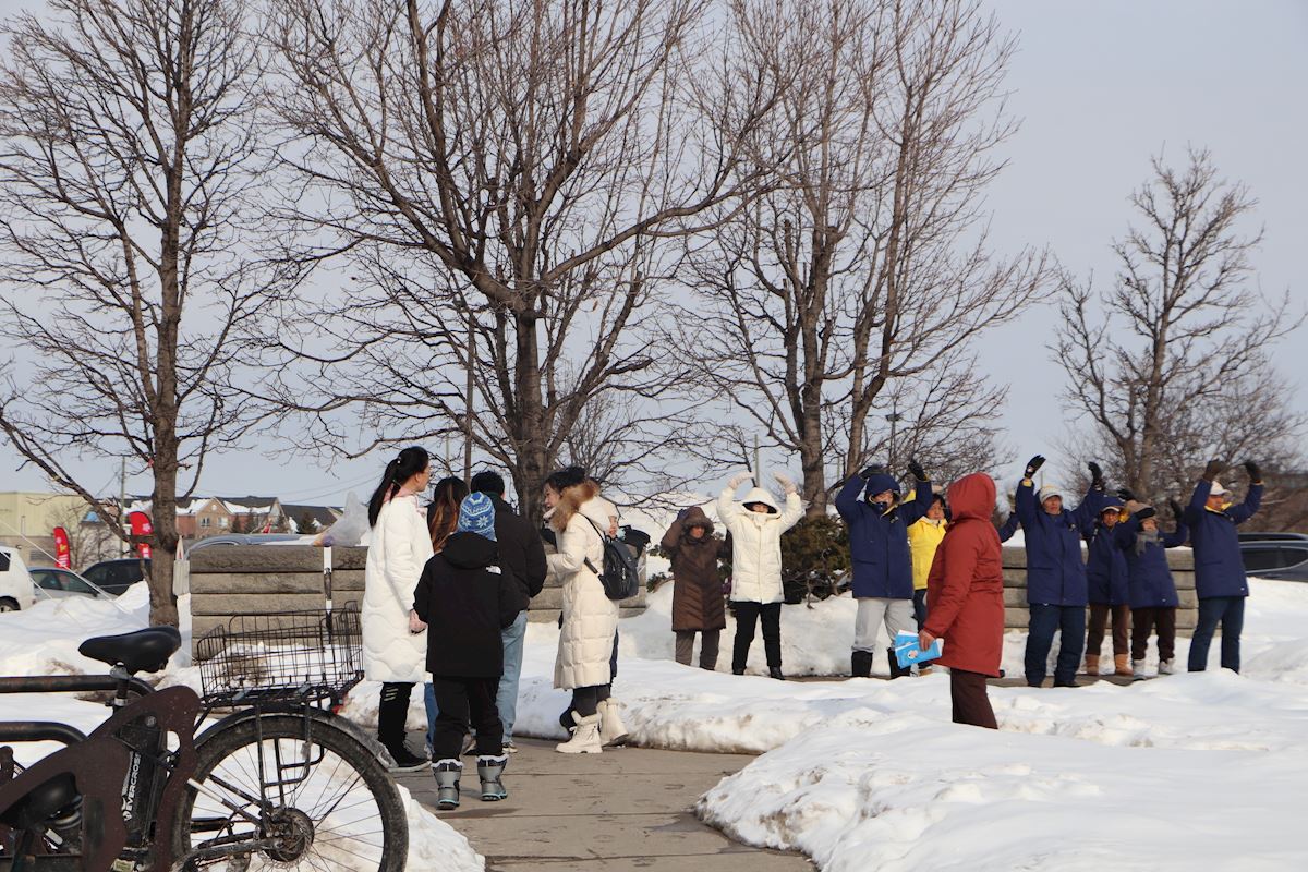 这位来自山东潍坊的女士说:“我就住这附近。我是来加拿大探亲的,给女儿带孩子,‘疫情’期间在多伦多待了半年,经常来太古,每次都看到你们在那把着杆拉着横幅,我一看都是反共产党的。我当时觉得你们是吃饱了撑了,我一次都没接你们的资料。”