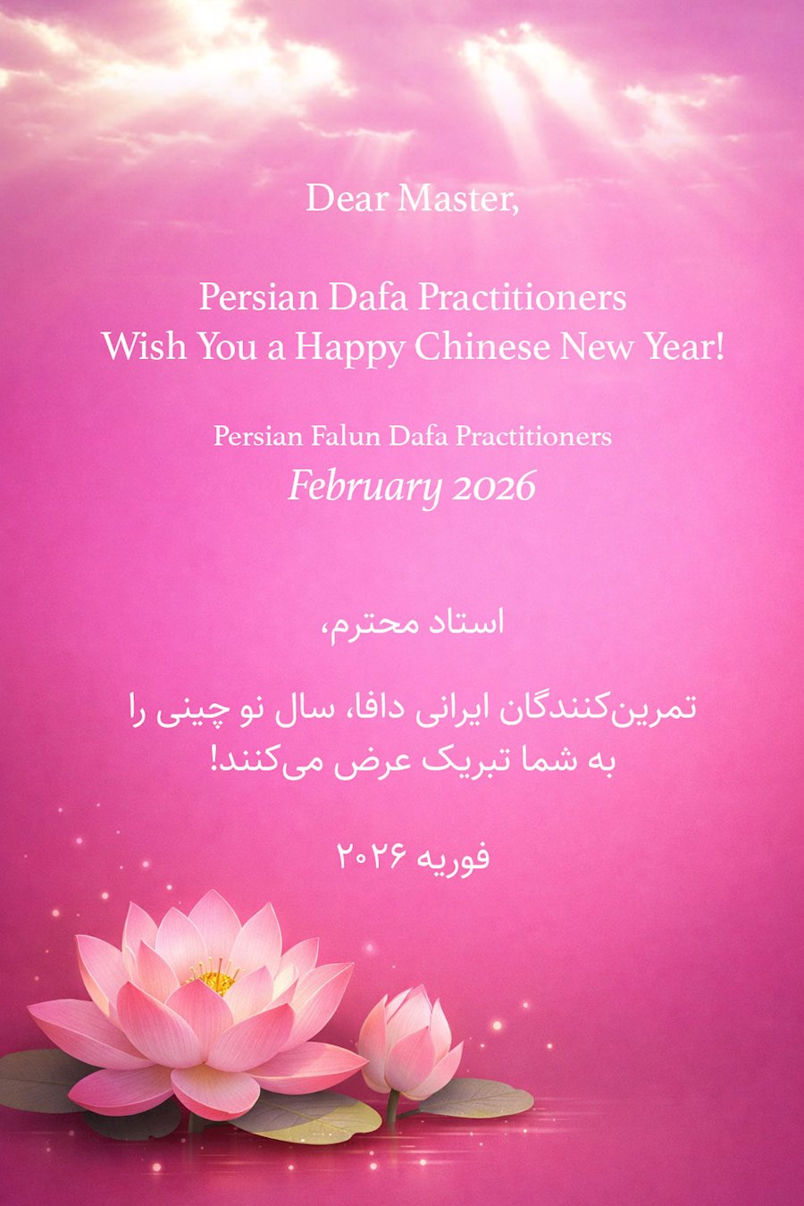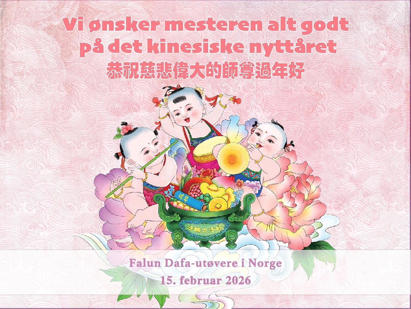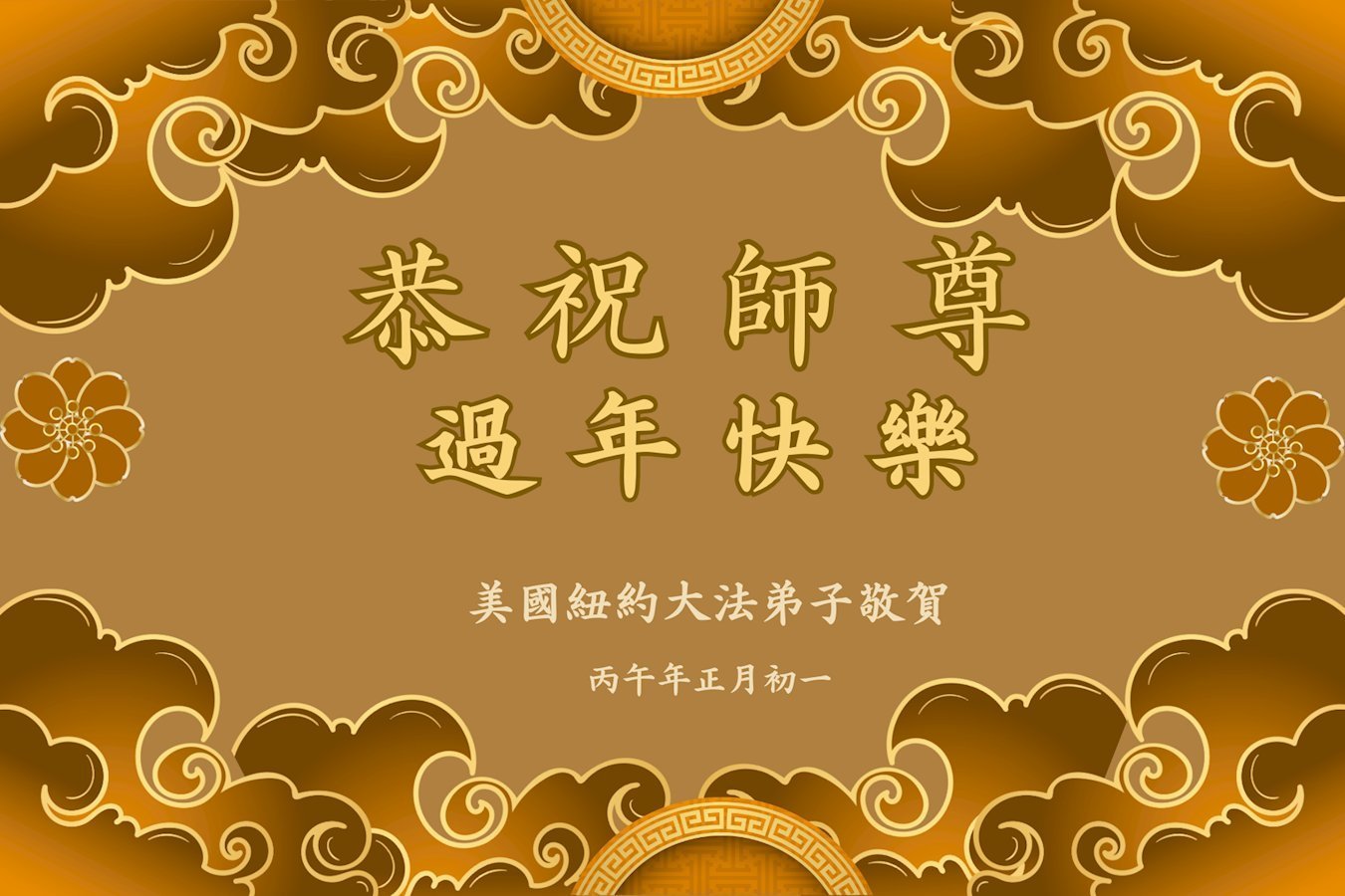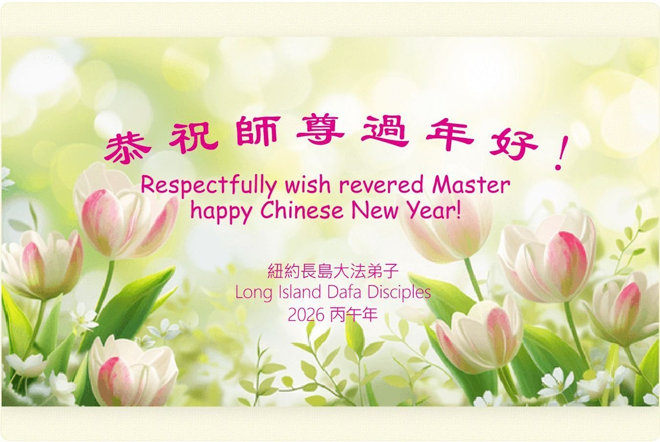 尊敬的李大师您好,您辛苦啦!在新年到来之际,我们一家给李大师拜个早年,祝李大师新年快乐!谢谢您的慈悲救度!