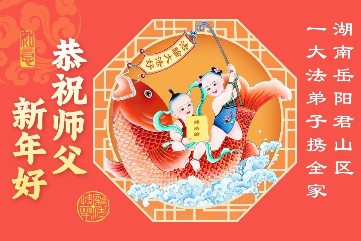 湖南岳阳君山区一大法弟子携全家恭祝师尊新年快乐!