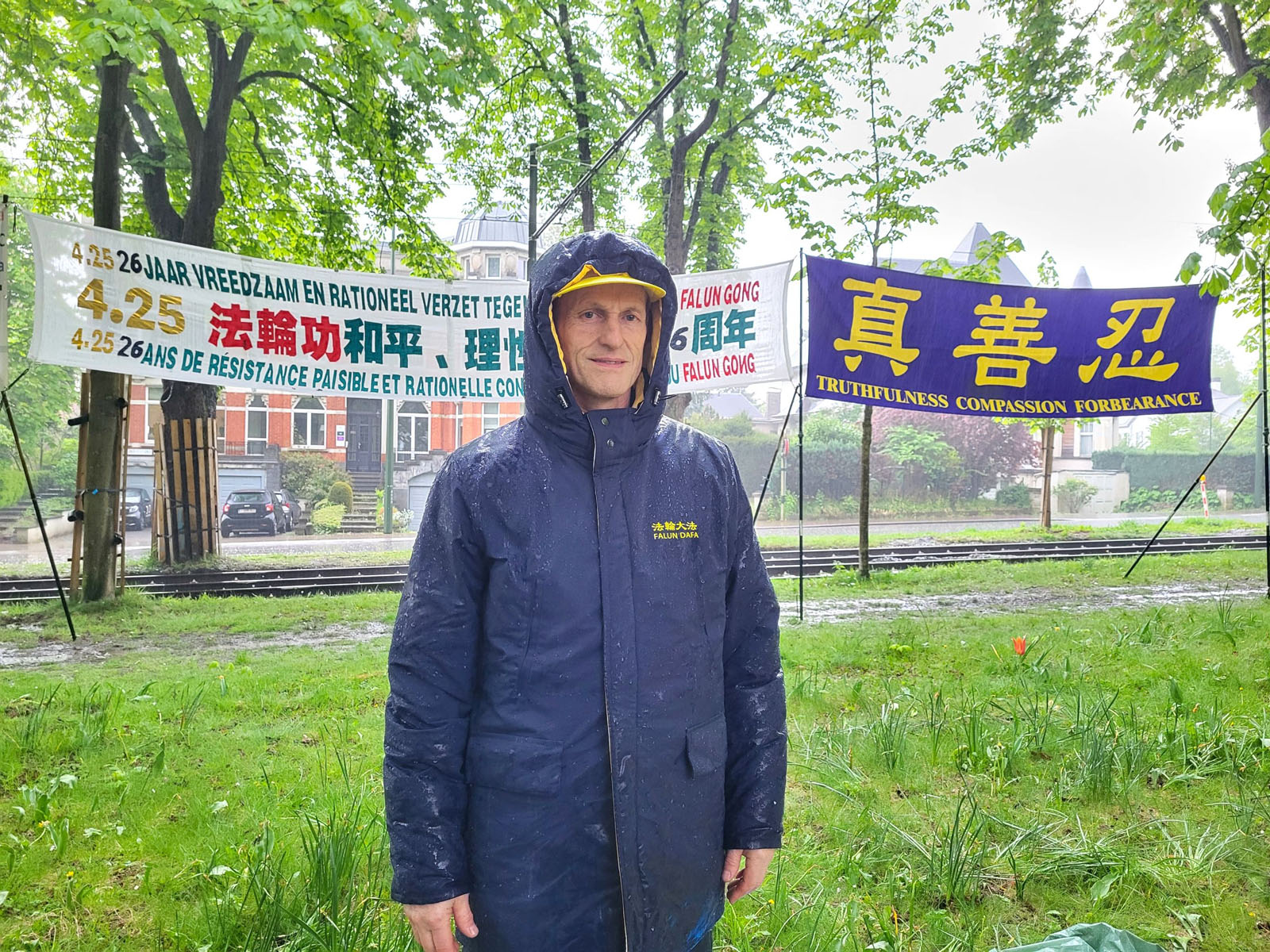 多年来,他希望把自己在大法修炼中获益的感悟与更多人分享,同时揭露中共对法轮功的迫害,他与家人一同参与在布鲁塞尔和各地举行的和平讲真相活动,呼吁社会各界关注中国法轮功学员的处境。其中之一的活动是在中共驻比利时使馆附近举行的,学员们以集体炼功和横幅展示来表达诉求。