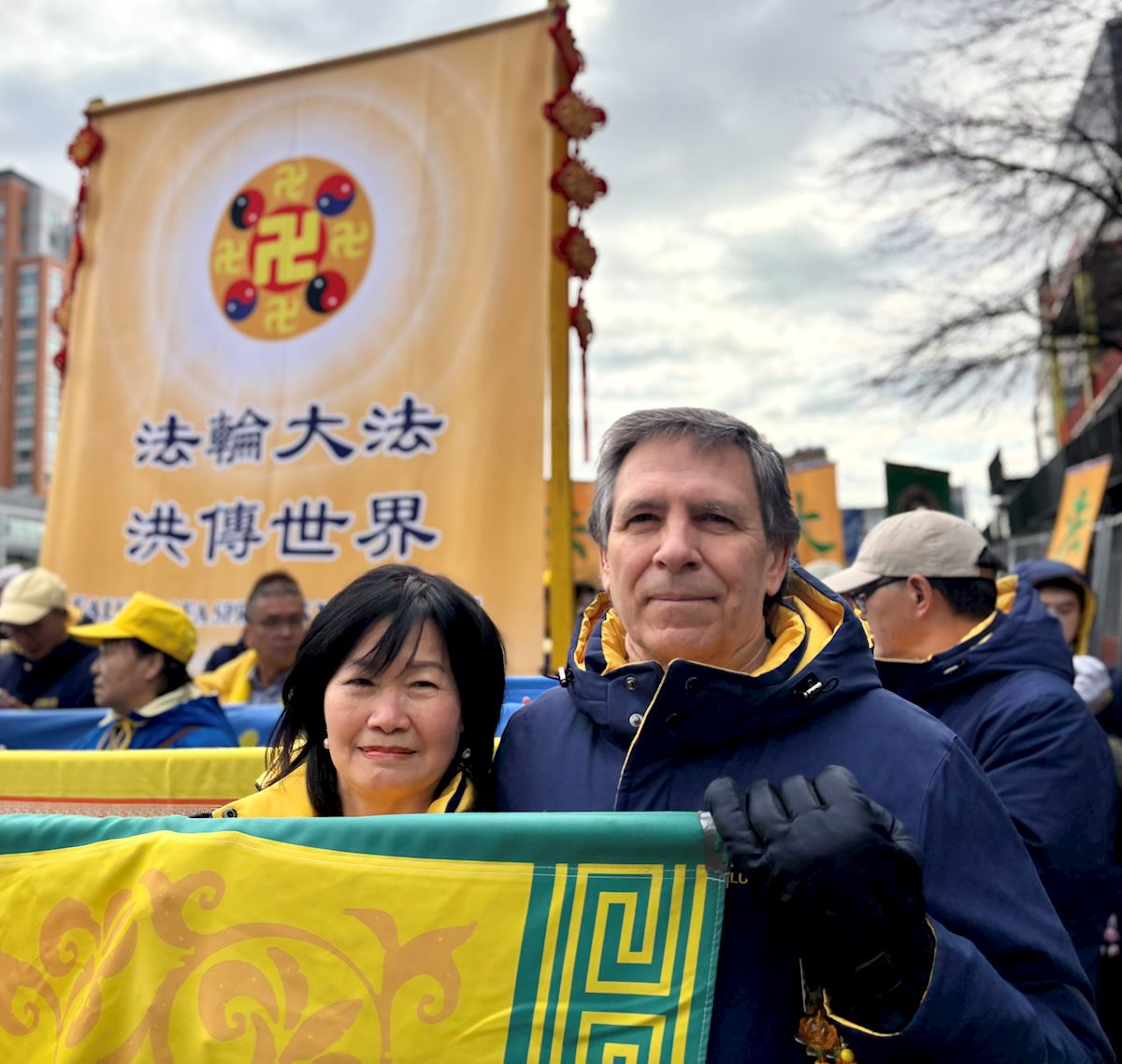 迈克・里弗斯(Mike Revers)和太太庭瑜去年刚刚从德克萨斯州搬来纽约, 里弗斯曾是德州休士顿的一位副警长,庭瑜退休前在台湾是一家公司的董事,他们夫妇二人当天参加了“法轮大法好”方阵打横幅。