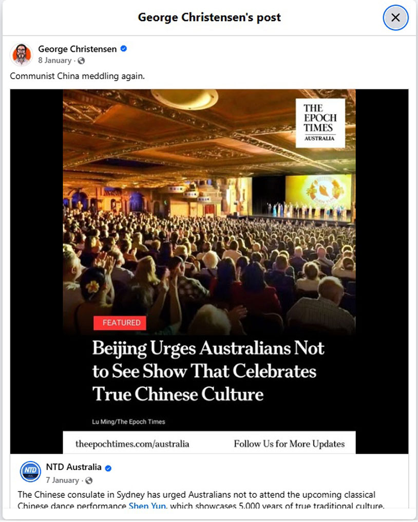 ![]() 图4:澳洲前联邦议员乔治・克里斯滕森(George Christensen)一月八日转发了新唐人电视台的相关报导,引发粉丝热议。 |