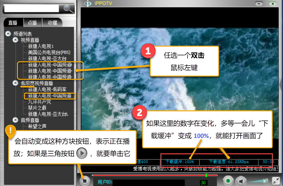 (3)启动爱博电视,稍等一会儿左侧会出现频道列表,如果长时间没有出现频道列表,可以关闭爱博电视,从新打开。直播栏目有三个“新唐人电视-中国频道”,用鼠标左键双击其中一个试试,然后等一会儿,如果数字在变化,多等一会儿就能打开画面了;如果数字不变,可以再次用鼠标左键双击“新唐人电视-中国频道”。注意观察左下角的播放按钮,正常情况下会自动变成方块按钮,表示已经在播放了;如果是三角按钮,则需要用鼠标左键单击它,让它变成方块按钮,進入播放状态。过程中要有耐心,一般多点几次都能打开的。如果多次尝试不能成功,也可以用鼠标左键双击频道列表中的“低带宽视频直播”中的“新唐人电视-中国频道”。