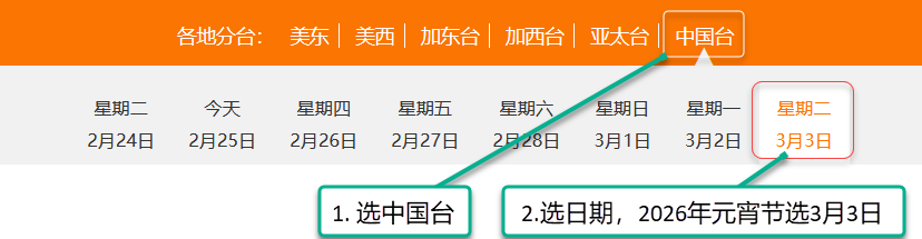 2、先点击右上角的中国台,然后点击日期,2026年元宵节选3月3日。如图: