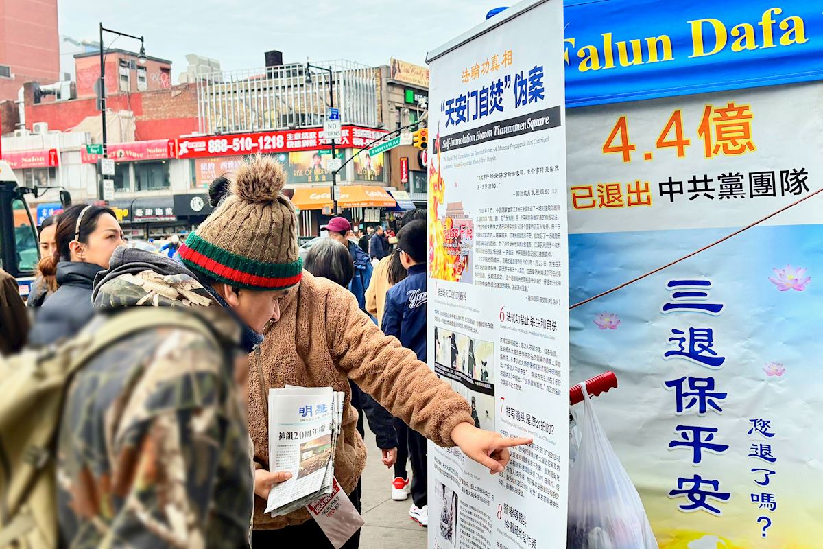 自二零零四年以来,法轮功学员长期在法拉盛街头设立多个真相点。法轮功学员都是自愿来做义工,在真相展板前向来往行人发放传单,与中西方路人交流,讲述法轮功自一九九九年以来遭受中共迫害和被污蔑的真相,并帮助中国人了解退出中共党团队组织的意义。二十多年来,很多法轮功学员风雨无阻,无论严寒酷暑都坚持站在街头,多年如一日在这里传播真相。