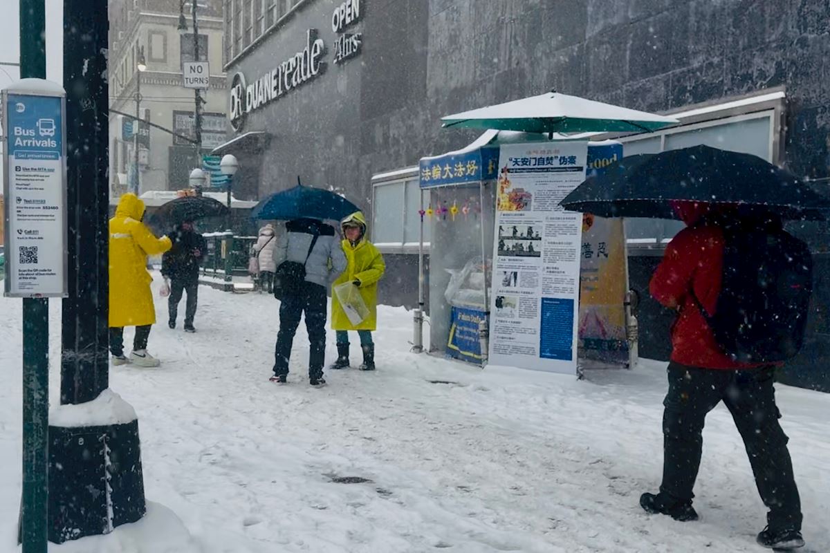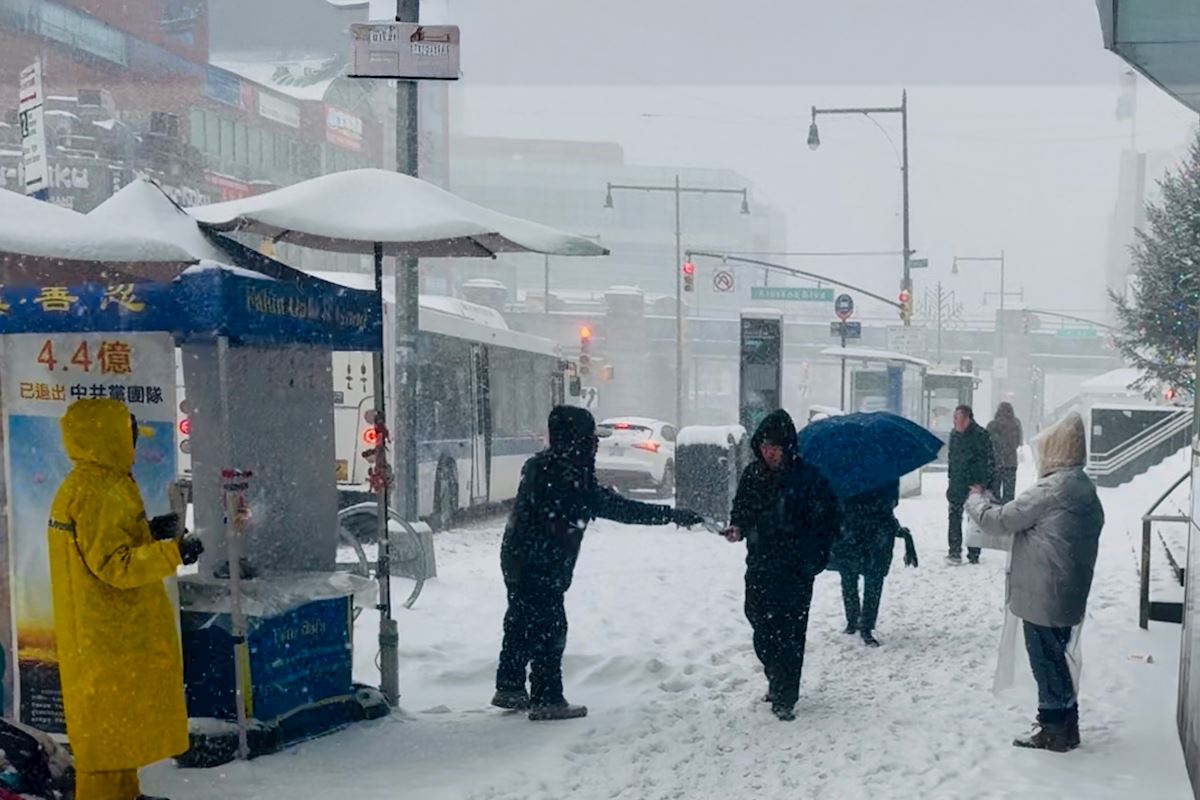 ![]() 图1~4:在美国纽约皇后区法拉盛的街头真相点上,许多法轮功学员无论严寒酷暑、风雨无阻,始终坚守在那里,向过往行人讲述真相。 |