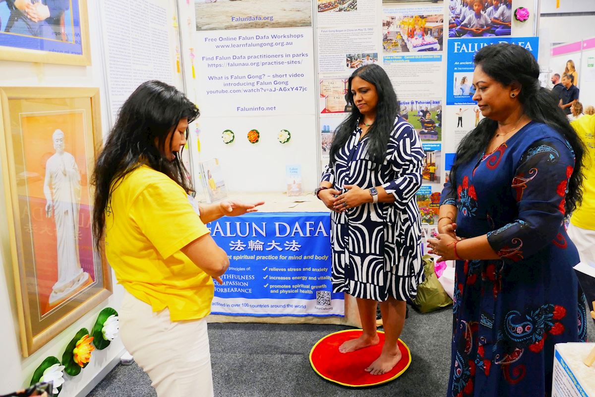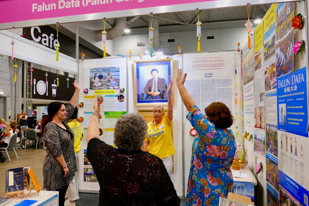 一位女士在尝试了其它修练方法后,最后被法轮功展位所吸引。由于她的母亲是中国人且曾居住在香港,她对中国文化有着浓厚的兴趣。在全神贯注地学习五套功法时,她感受到了法轮大法的能量场,并感觉到能量在她体内涌动,强而有力,这让她感到非常惊讶。法轮功学员鼓励她加入集体炼功,以便进一步学炼功法,并建议她访问大法网站获取更多信息。