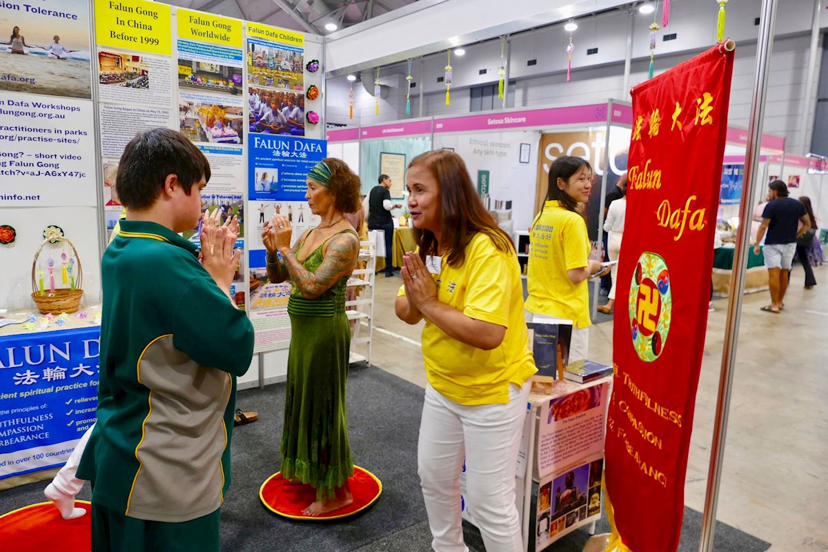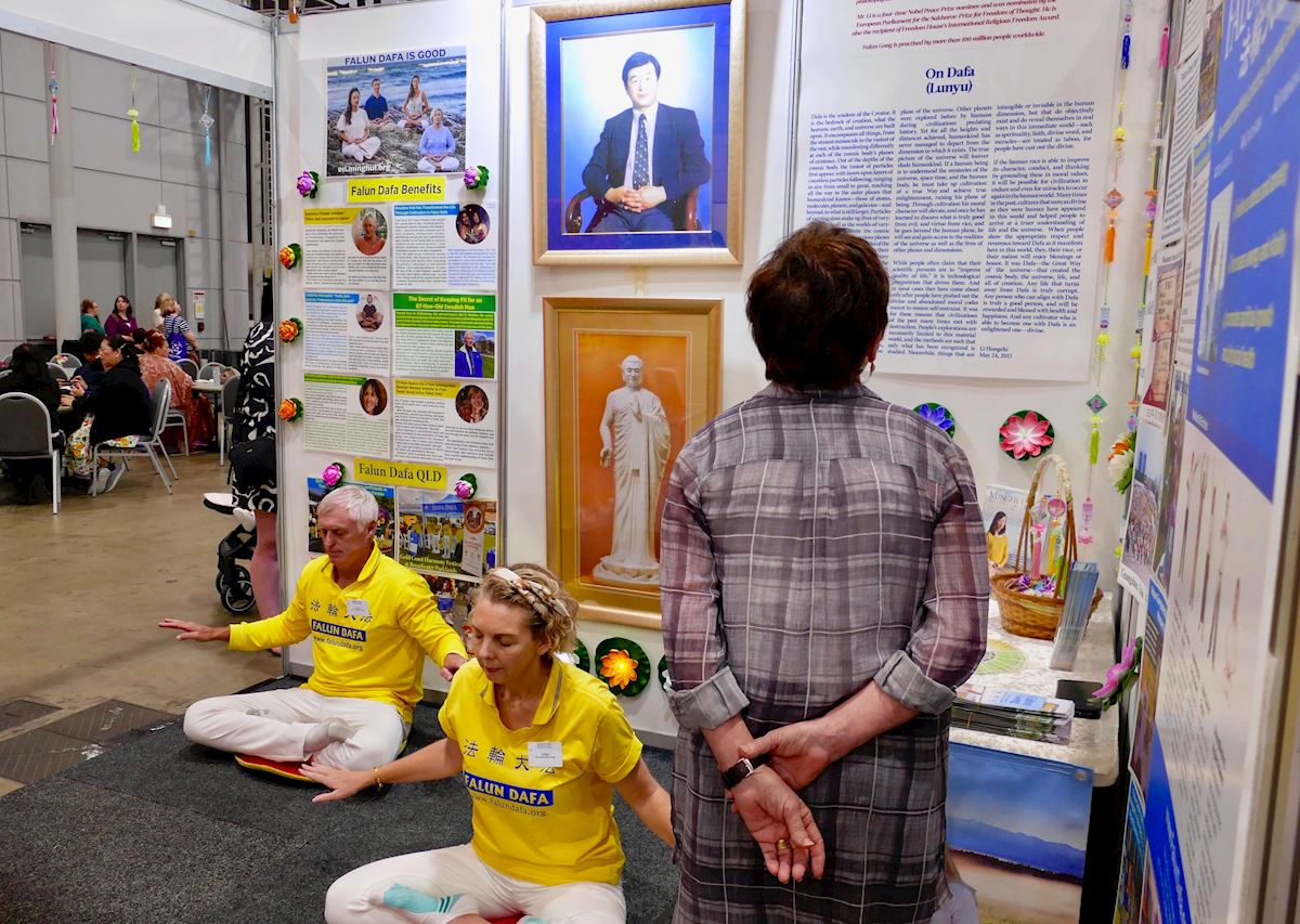 法轮大法展位前人流总是络绎不绝,靓丽且富有正能量的展位吸引了许多人驻足观看,他们不但浏览展位的背景资料,并与学员交谈。法轮功学员在展位上演示了祥和、平静和缓慢的法轮功全部五套功法,人们当场学炼功法,有人还购买了法轮功书籍,并咨询如何能参与当地炼功点的炼功。