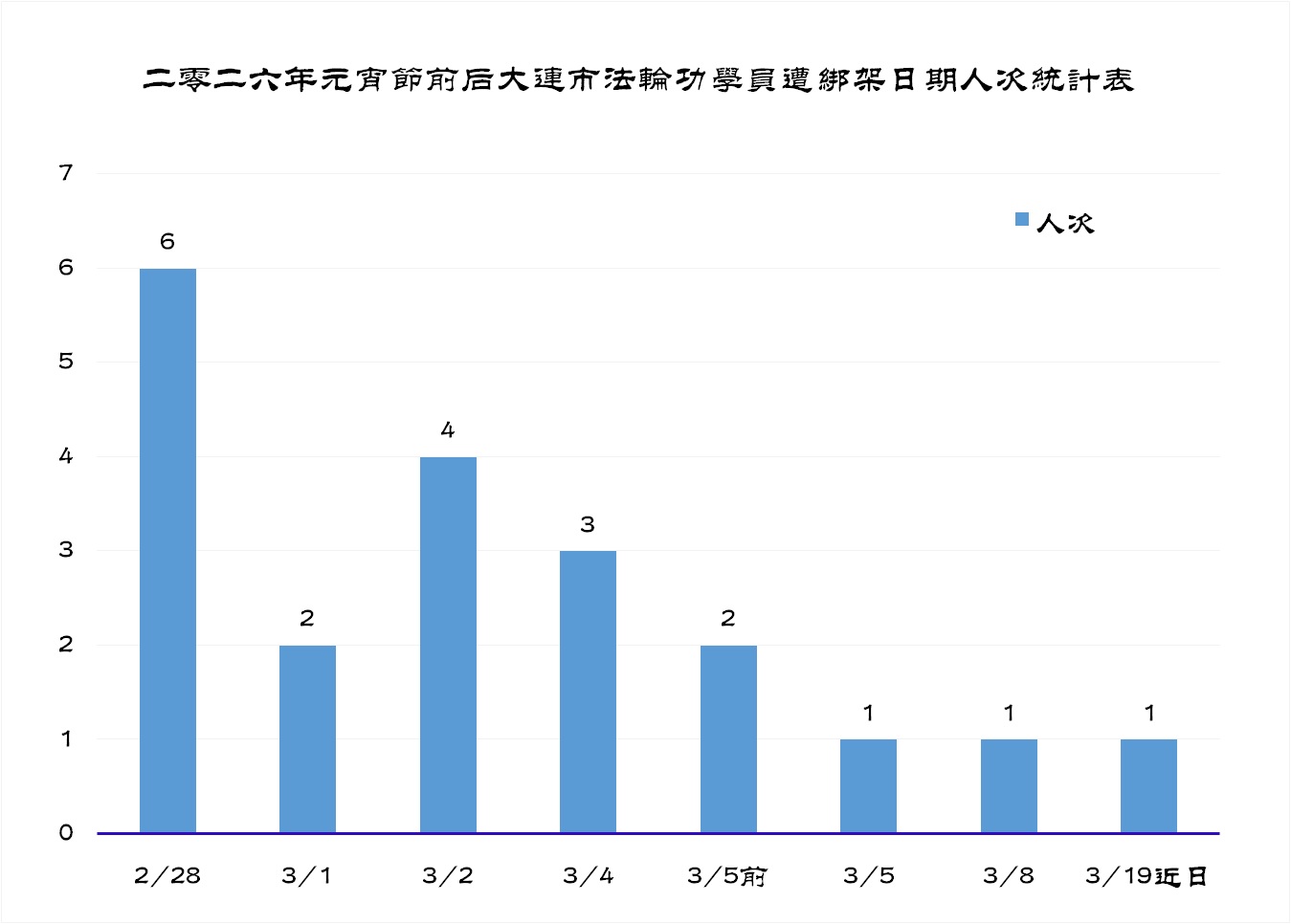 ![]() 图1、二零二六年元宵节前后大连市法轮功学员遭绑架日期人次统计表 |