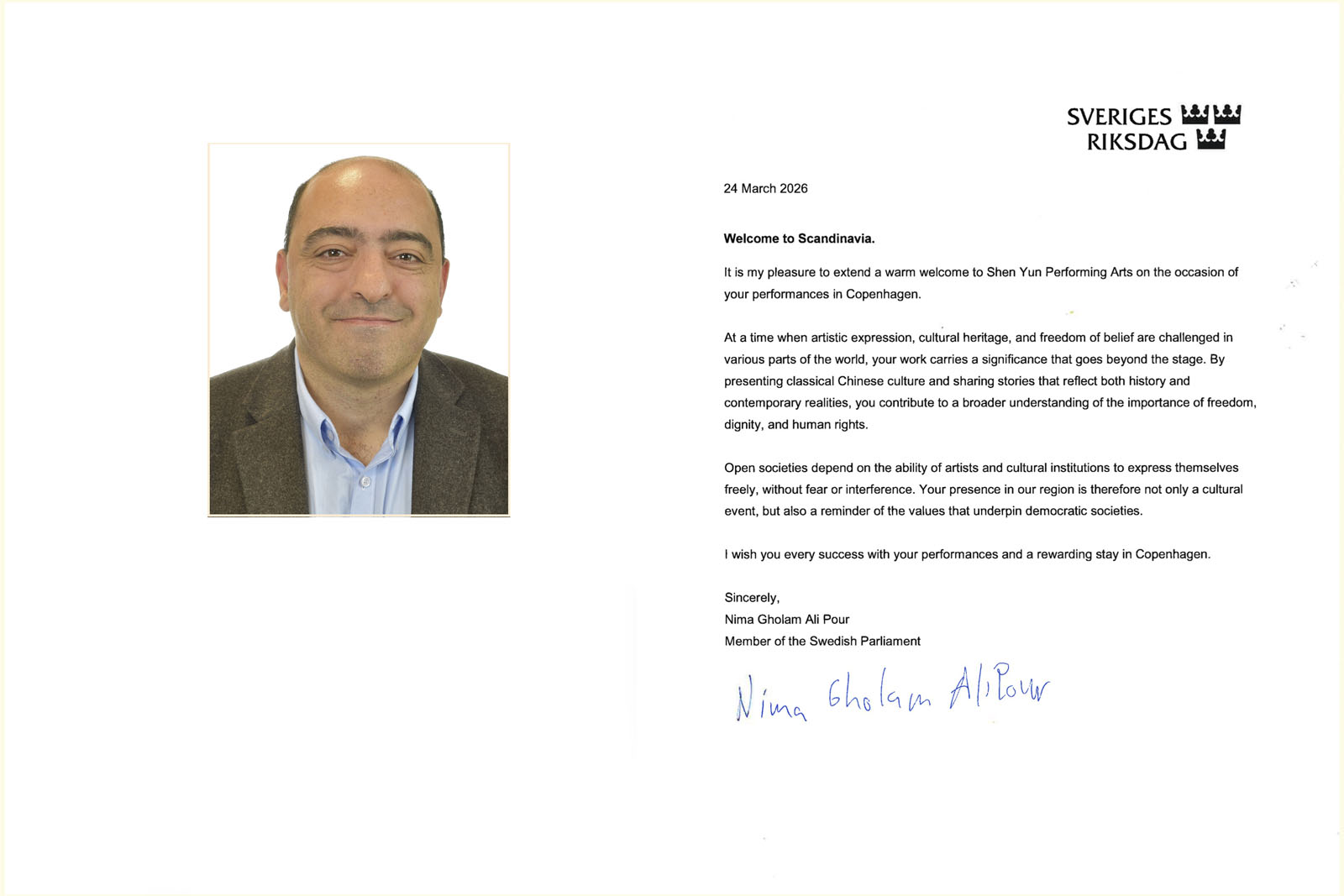 瑞典南部斯堪尼省与哥本哈根比邻,相隔一桥,很多观众翘首以待。适逢神韵二十周年全球巡回之际, 来自该选区的瑞典国会议员尼玛·古拉姆·阿里·普尔(Nima Gholam Ali Pour)在三月二十四日发来贺信,热烈欢迎神韵再次莅临斯堪地那维亚: