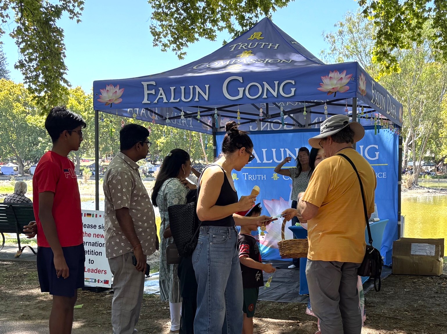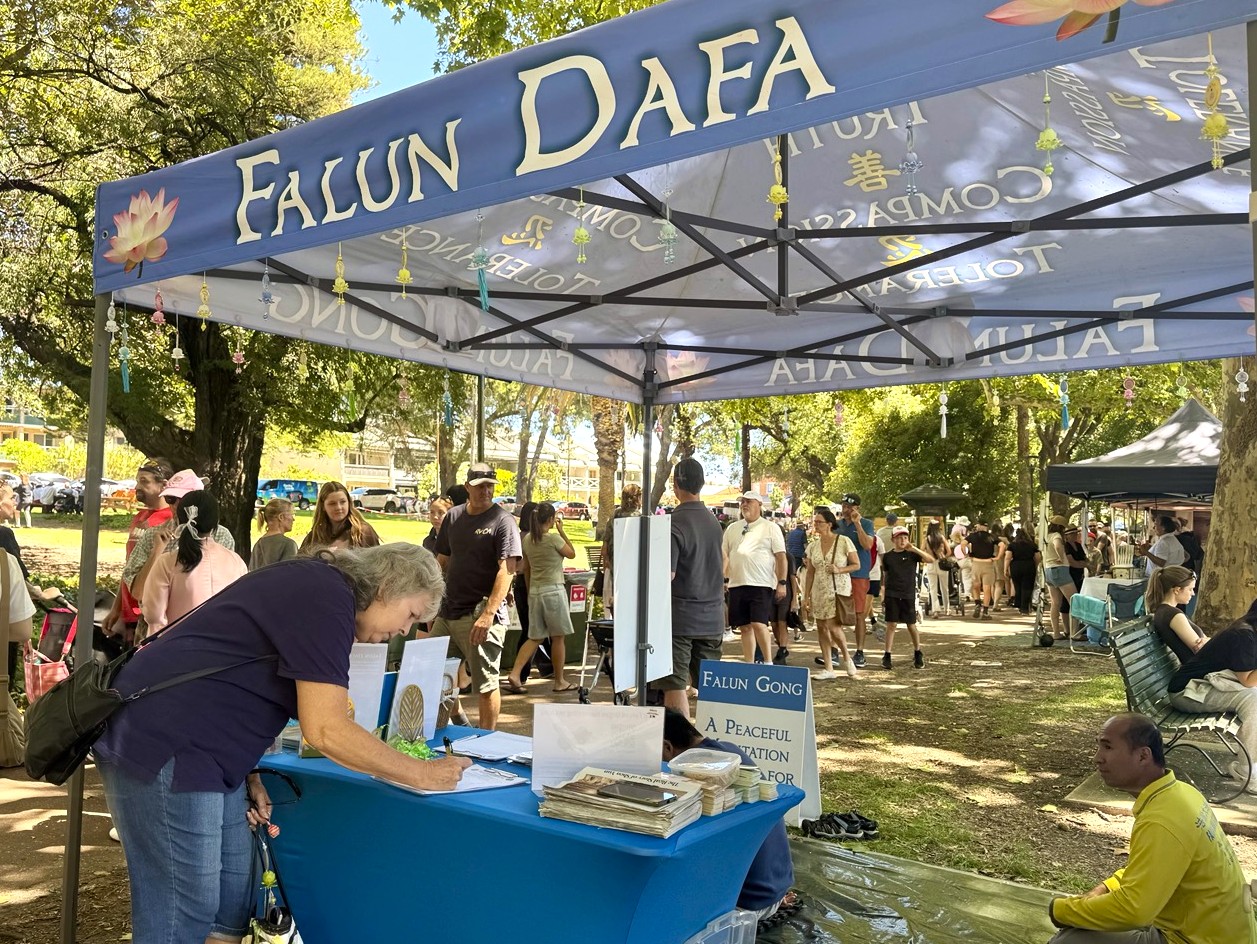 法轮功学员的展位前听真相的民众络绎不绝。 法轮功学员们向西澳的民众传递真、善、忍的普世价值;并送上学员们自制的精美小莲花,讲解莲花上的“法轮大法好”和“真善忍好”的内涵;以及如何利用二维码直接扫描进入法轮大法的官方网站(falundafa.org)。民众听到在中国发生的中共对法轮功学员的迫害时,主动签署制止迫害的请愿书。