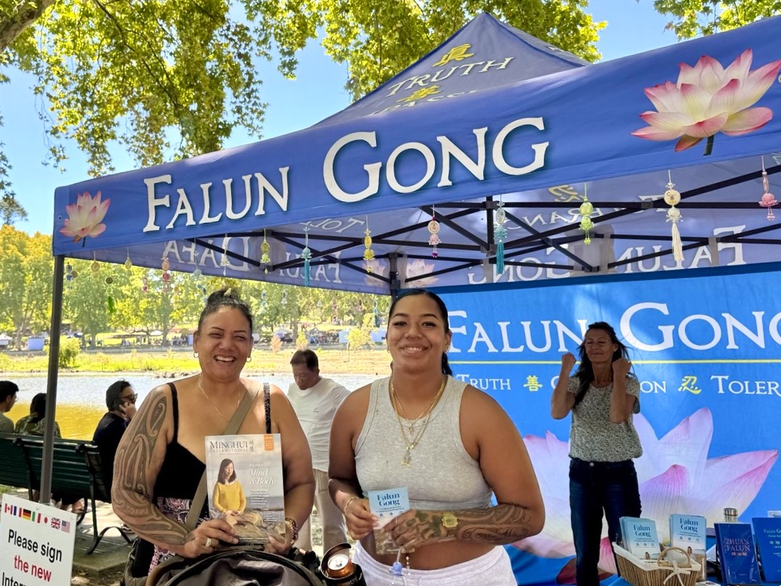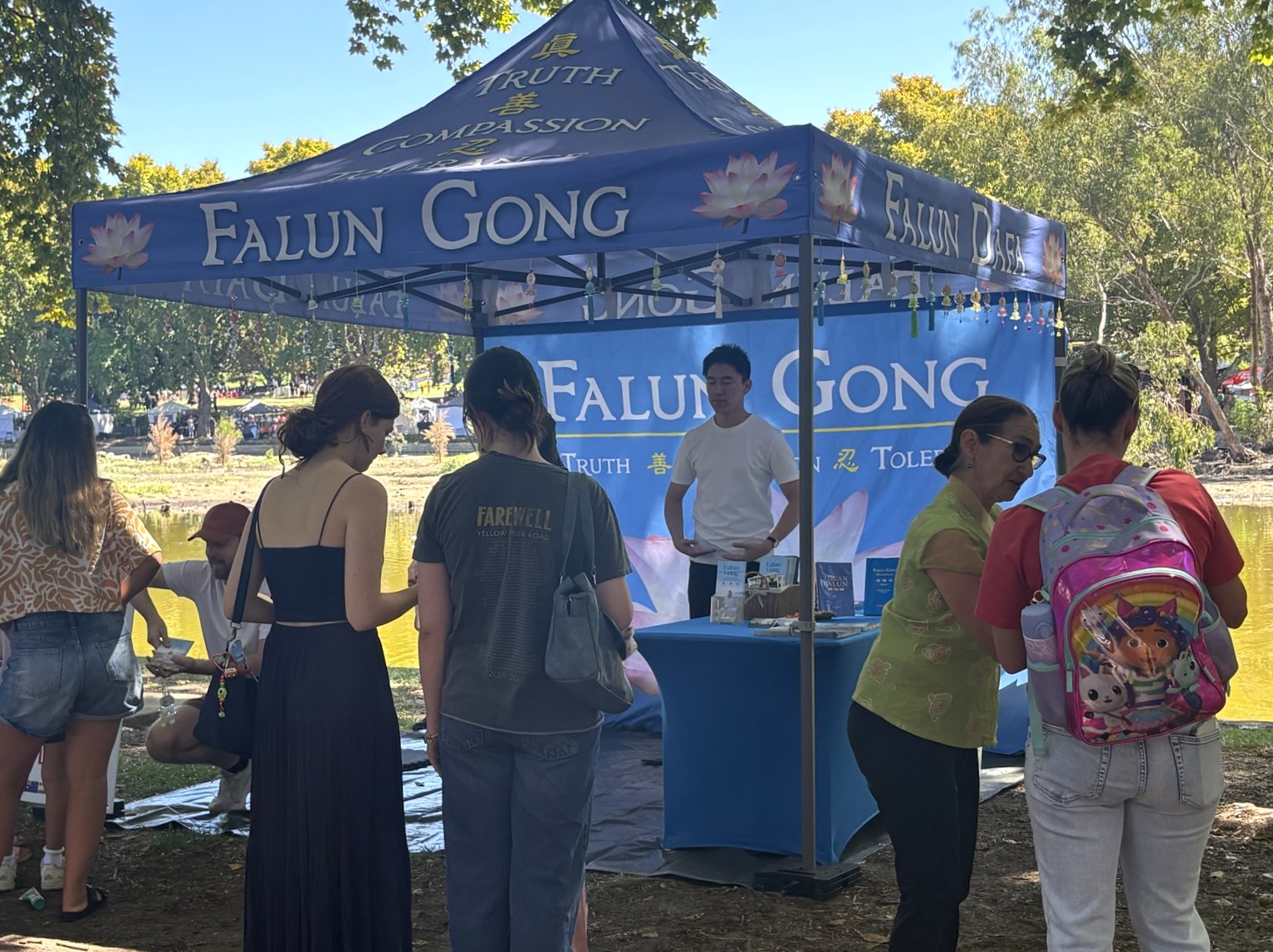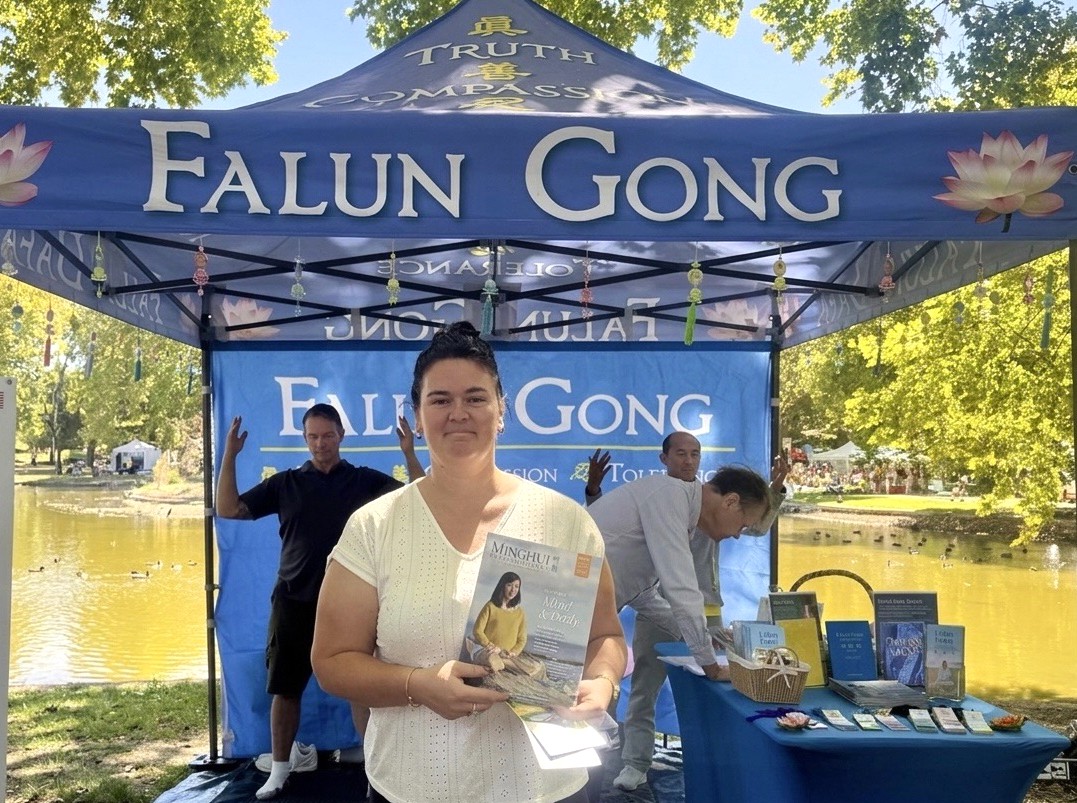 蒂根·格林(Tegan Green)径直来到法轮大法展位前,她表示想学法轮大法来净化内心。她说:“这个世界确实需要更多的真、善和忍。百分之百!我赞同。”