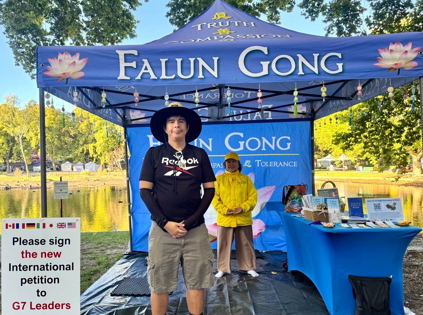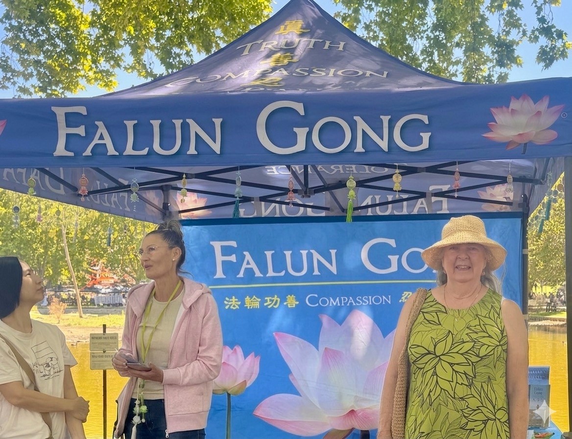 茗(Ming)是一位中国人,天主教徒,她在法轮大法展位前和学员们聊天。她分享:“这个世界需要干净的能量。现在的情况是鱼龙混杂,我们需要净化自己的能量,才能净化世界。改变(自身)思想,才能改变世界。我们需要积极的思想和能量。我不是法轮功学员,但总的来说,我认为真、善、忍(的理念)是正确的。”