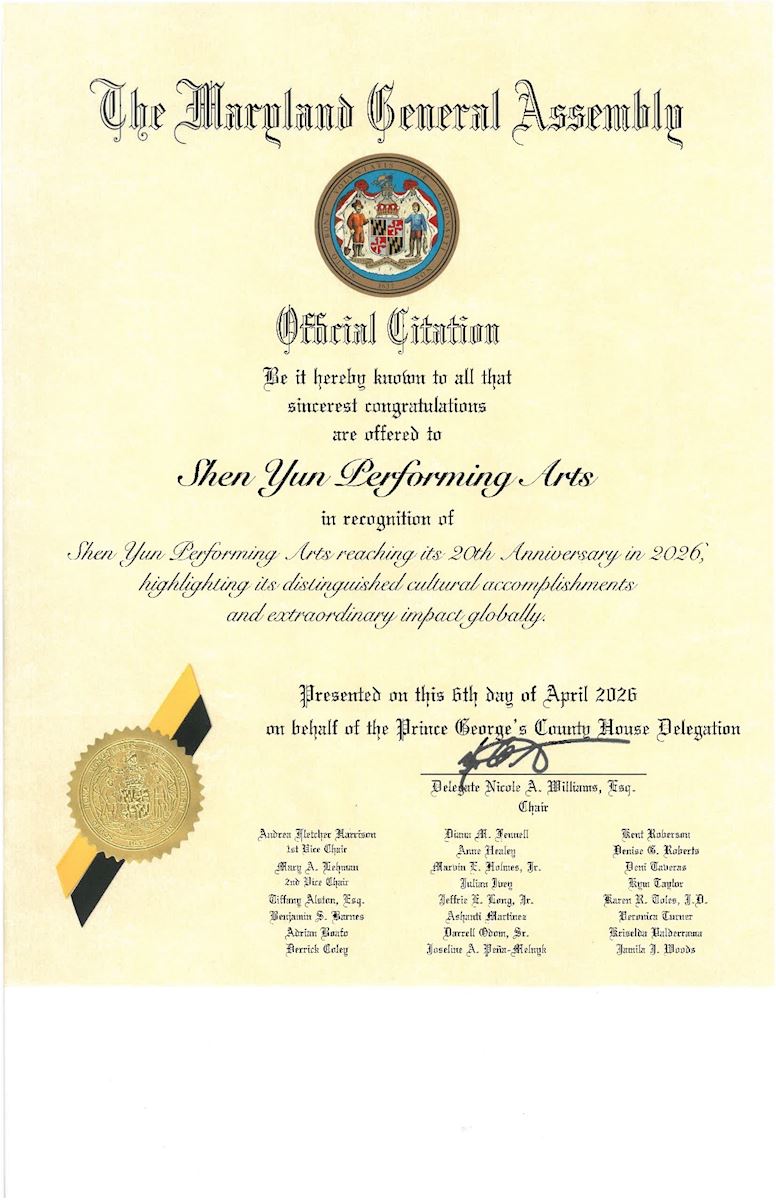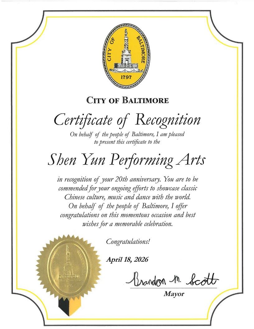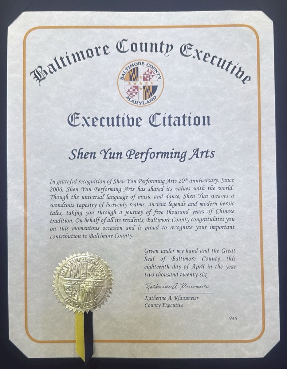谨以此表达对神韵艺术团成立二十周年的诚挚嘉许。自2006年以来,神韵艺术团始终致力于向世界弘扬其所秉持的价值观。通过音乐与舞蹈这一全人类共通的语言,神韵编织出一幅奇妙的画卷,展现了天国胜境、古老传说及现代英雄传奇,引领观众踏上一段穿越五千年中华传统文化的旅程。巴尔的摩县谨代表全体居民,在这个具有里程碑意义的时刻,向你们致以祝贺;同时,表彰你们对巴尔的摩县所作出的贡献,我们为此感到荣幸。