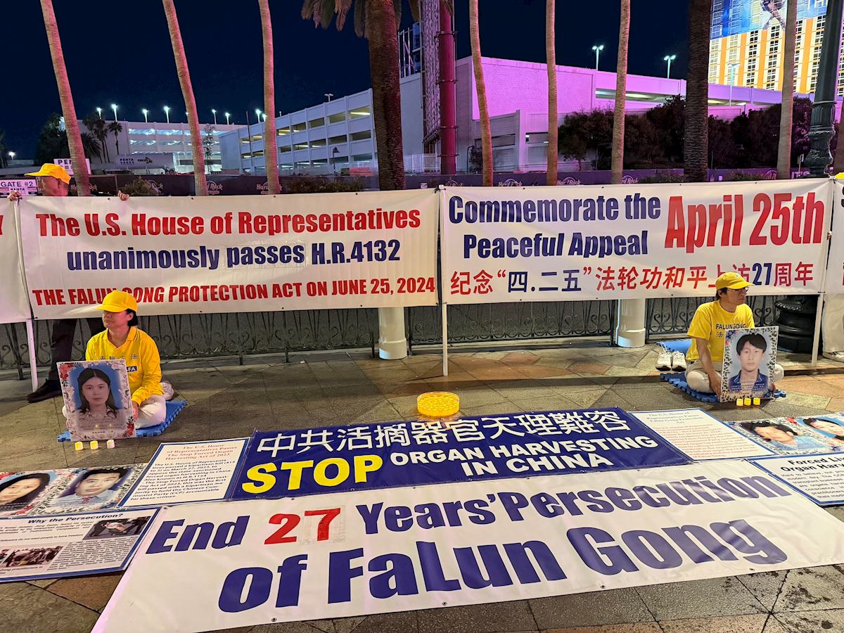 '图1:二零二六年四月十八日傍晚,美国拉斯维加斯部分法轮功学员,在市中心赌场大道威尼斯赌场酒店(The Venetian)前举办活动,纪念二十七年前发生在北京的震惊中外的法轮功学员和平上访事件。'