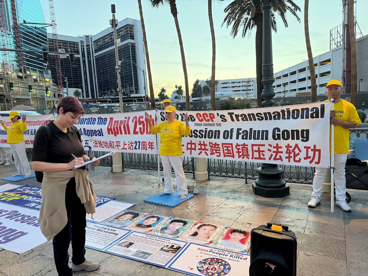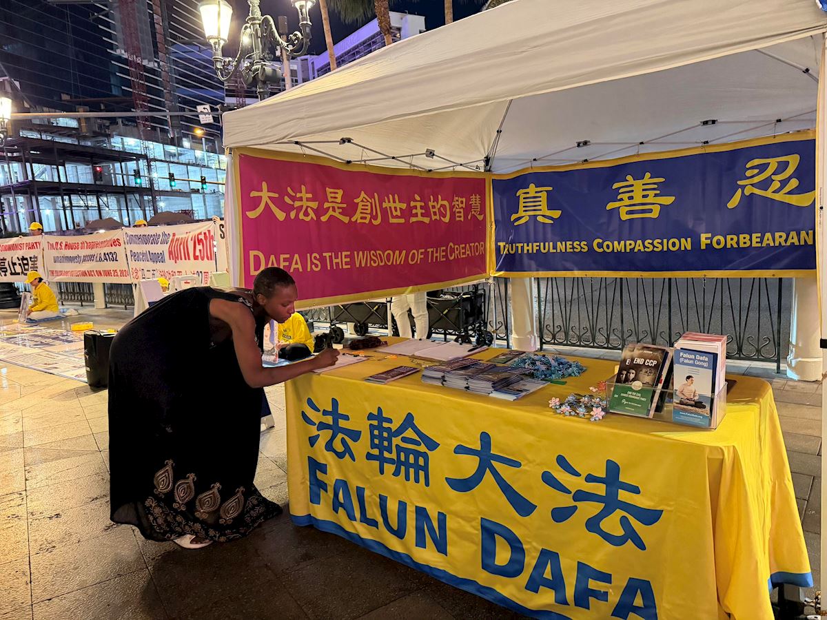 当晚本地居民塔米(Tami)和一位男士经过活动现场,看到学员展示的横幅内容,主动过来和学员交谈。一位学员告诉他们,法轮功是以真、善、忍为基点的古老的修炼方式,可以强身健体、提升道德,但在中国遭受迫害长达二十七年。另一位学员补充说中国政府(CCP)活摘法轮功学员器官进行贩卖,是一条龙秘密大屠杀。他们之前不了解法轮功以及被迫害、被摘取器官的资讯,听后非常震惊和气愤。