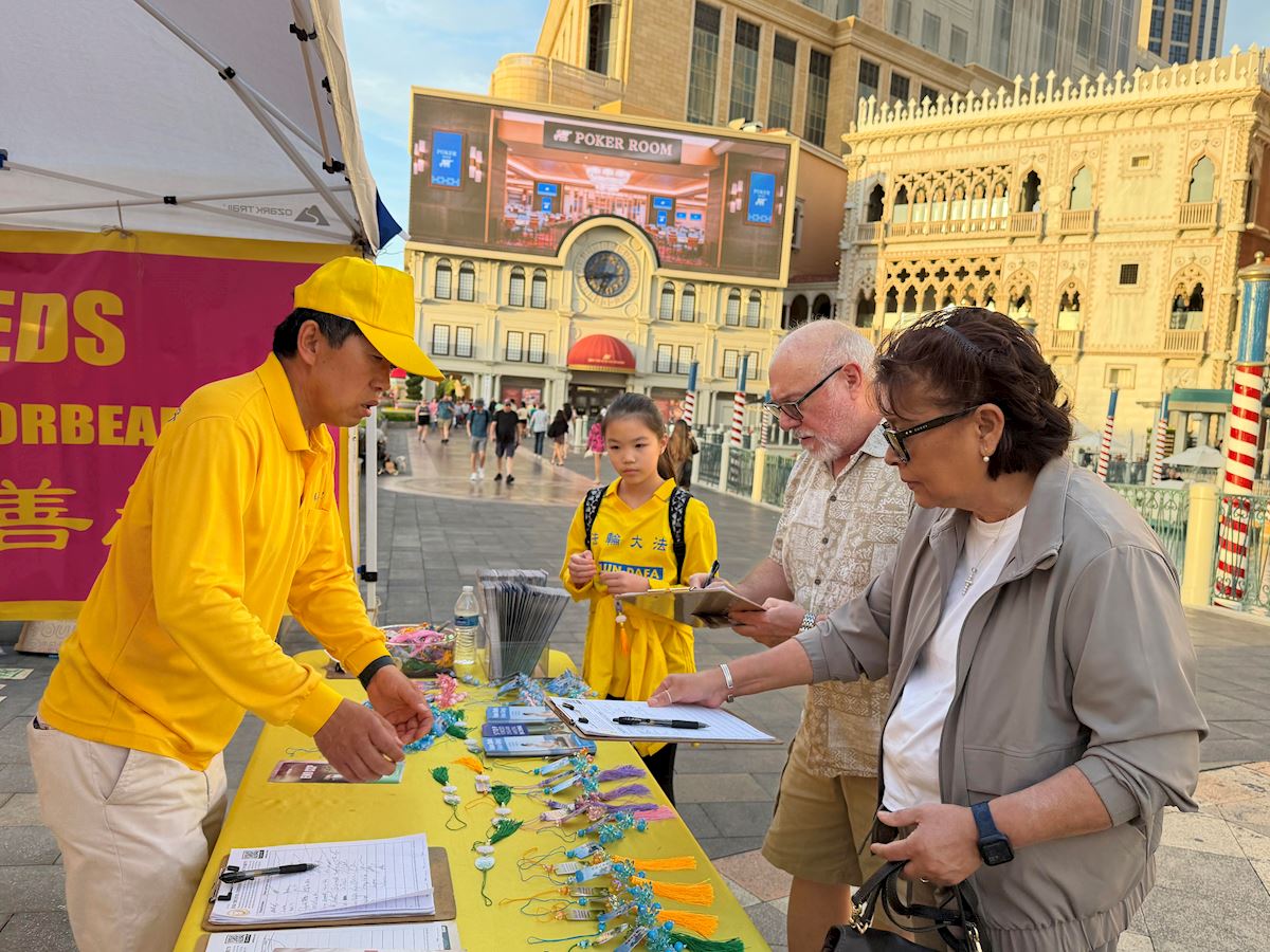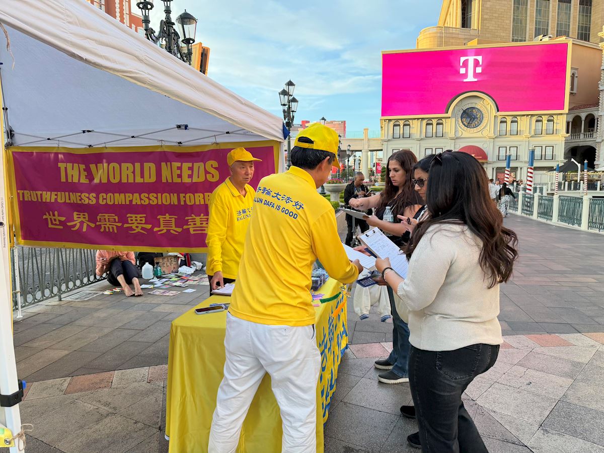 当天傍晚的活动现场,学员们支起帐篷,挂起真相条幅,醒目的文字内容吸引了赌城大道上往来穿梭的人群。他们有的驻足观看;有的接过学员发放的真相传单,和学员交流,了解究竟发生了什么;也有的在征签表上签名,支持学员反迫害。