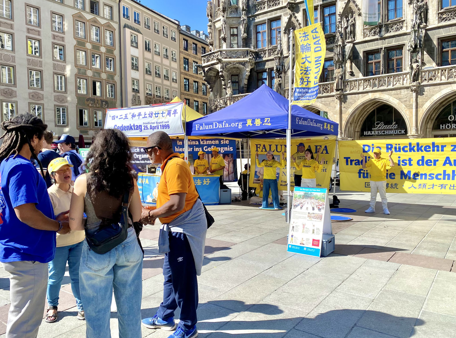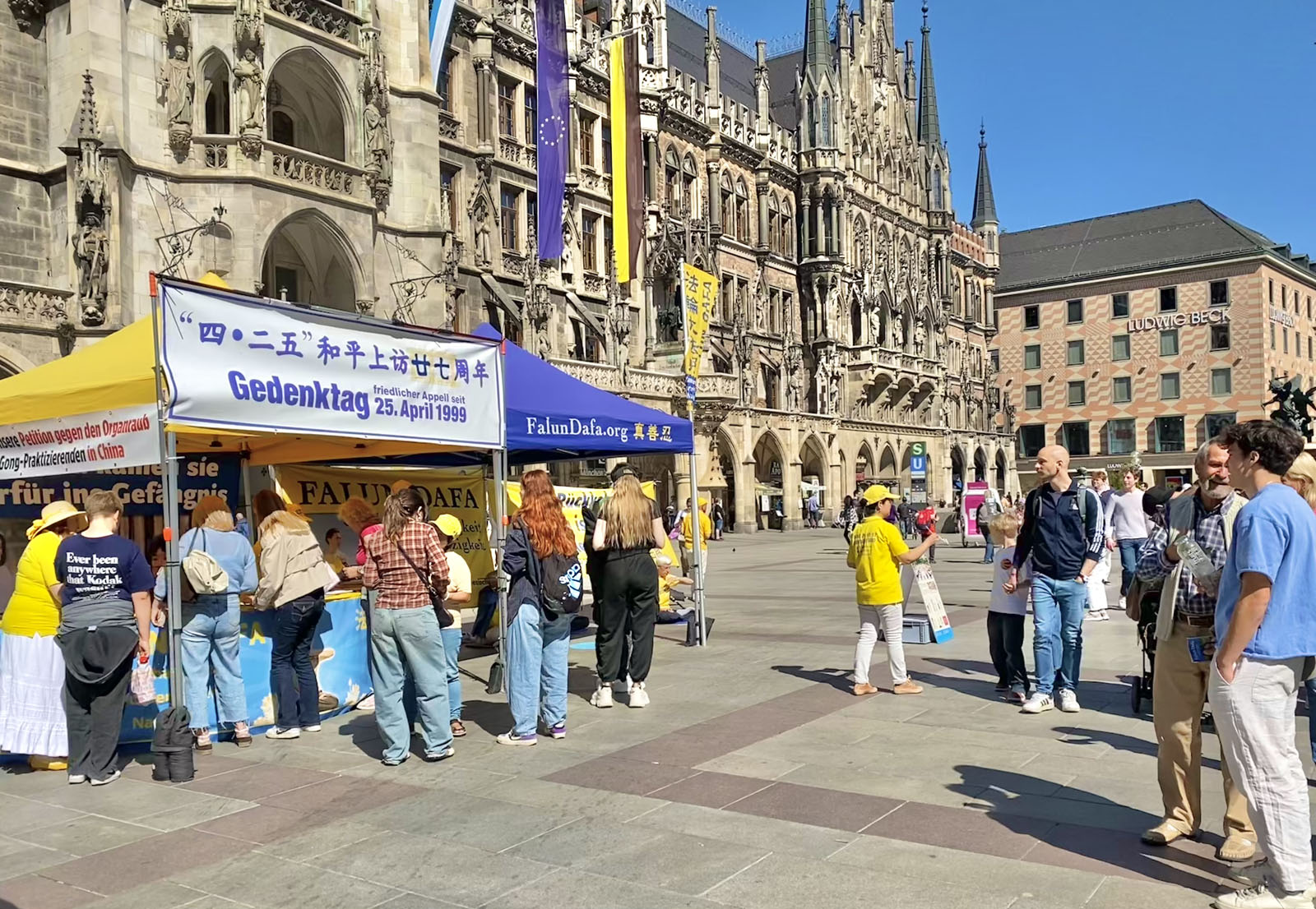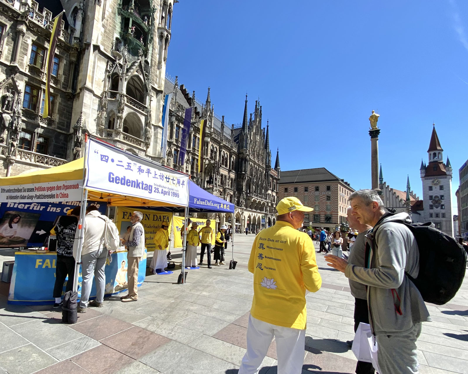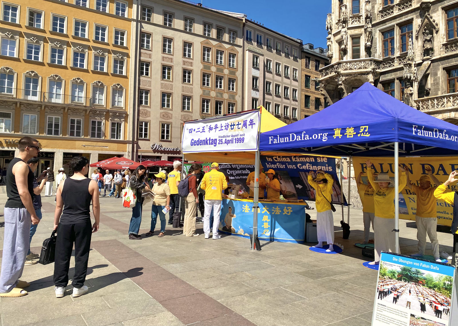 图1:二零二六年四月二十五日,来自德国巴伐利亚的部分法轮功学员在首府慕尼黑的玛丽亚广场举办了活动,纪念四·二五和平上访27周年。
