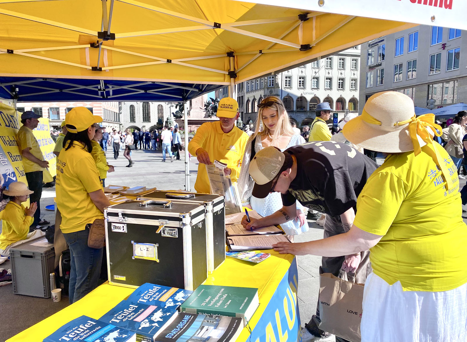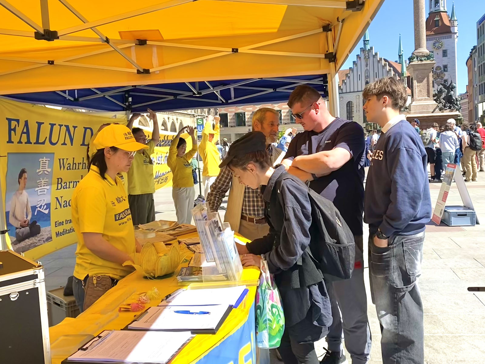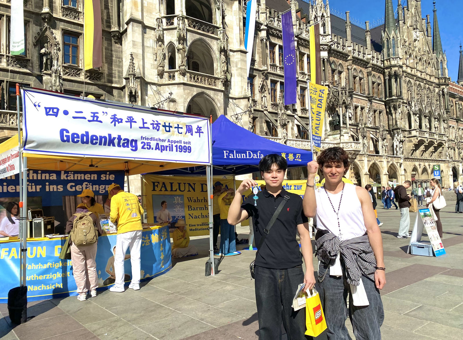 图1:二零二六年四月二十五日,来自德国巴伐利亚的部分法轮功学员在首府慕尼黑的玛丽亚广场举办了活动,纪念四·二五和平上访27周年。