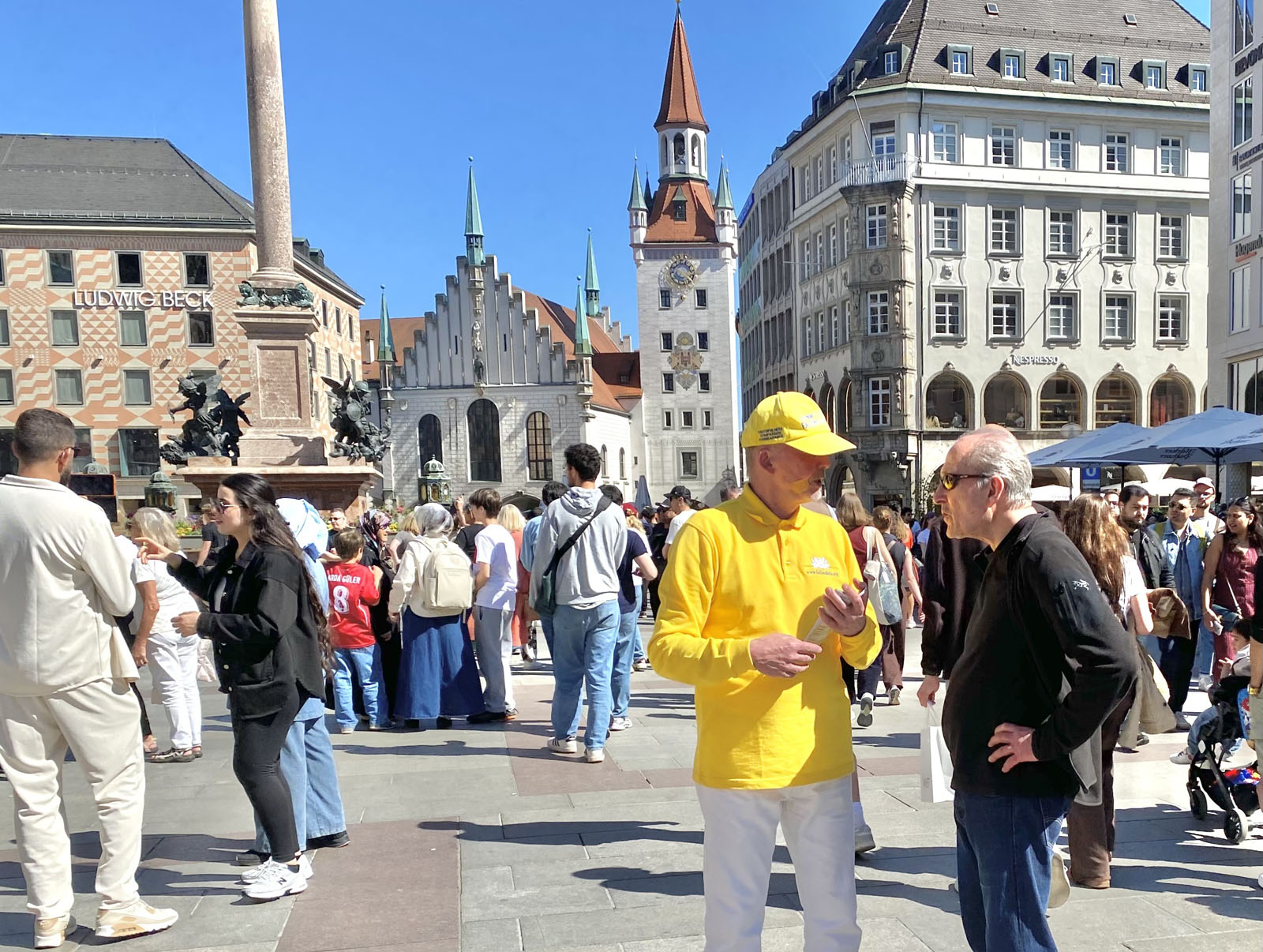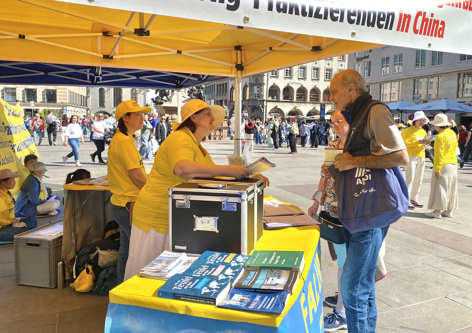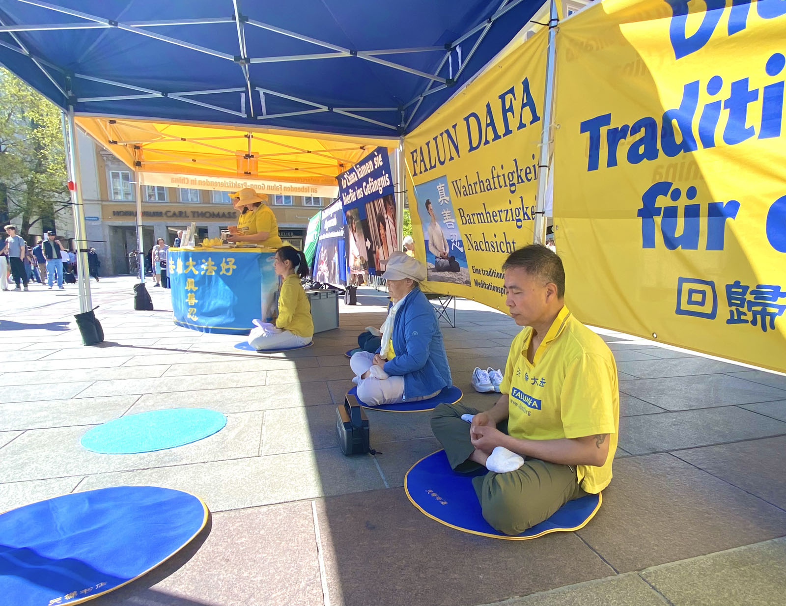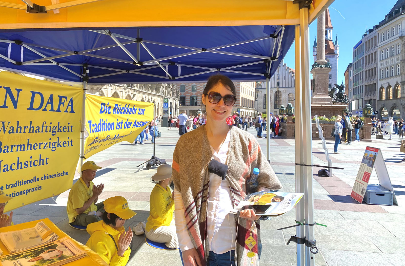 图1:二零二六年四月二十五日,来自德国巴伐利亚的部分法轮功学员在首府慕尼黑的玛丽亚广场举办了活动,纪念四·二五和平上访27周年。