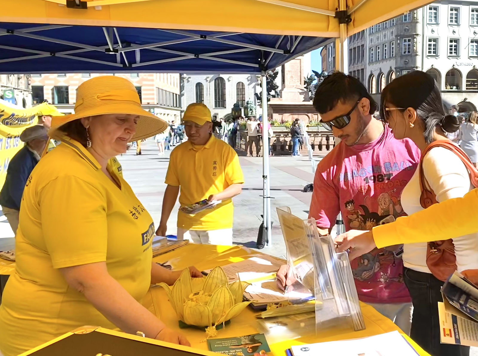 见习记者莫里兹・普兰特Moritz Planter和朋友程亮看到法轮功学员活动后,跟学员进行交谈,并签名声援法轮功学员反迫害。