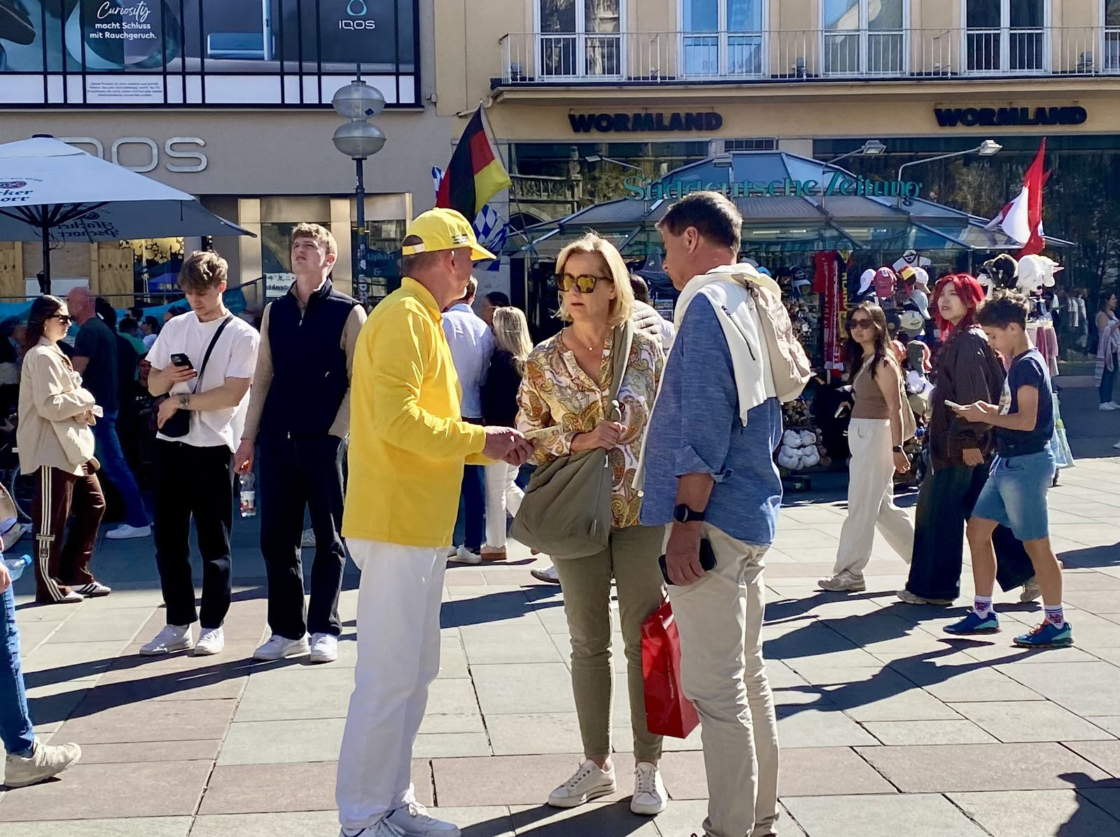 【明慧网二零二六年四月二十六日】(明慧记者德祥德国慕尼黑报道)二零二六年四月二十五日,来自德国巴伐利亚的部分法轮功学员在首府慕尼黑的玛丽亚广场举办活动,纪念四·二五和平上访27周年。活动得到当地民众支持,也有些来自中国大陆的留学生与华人当场退出中共各种组织。