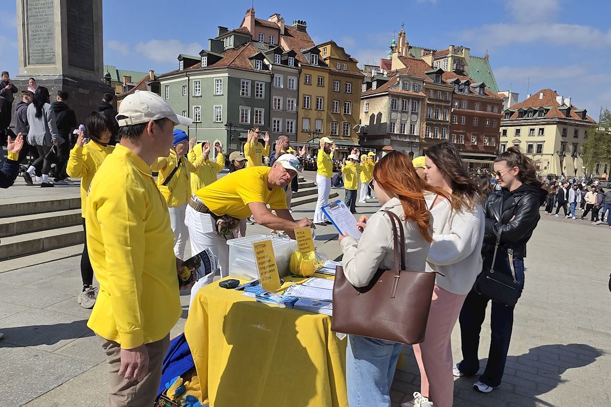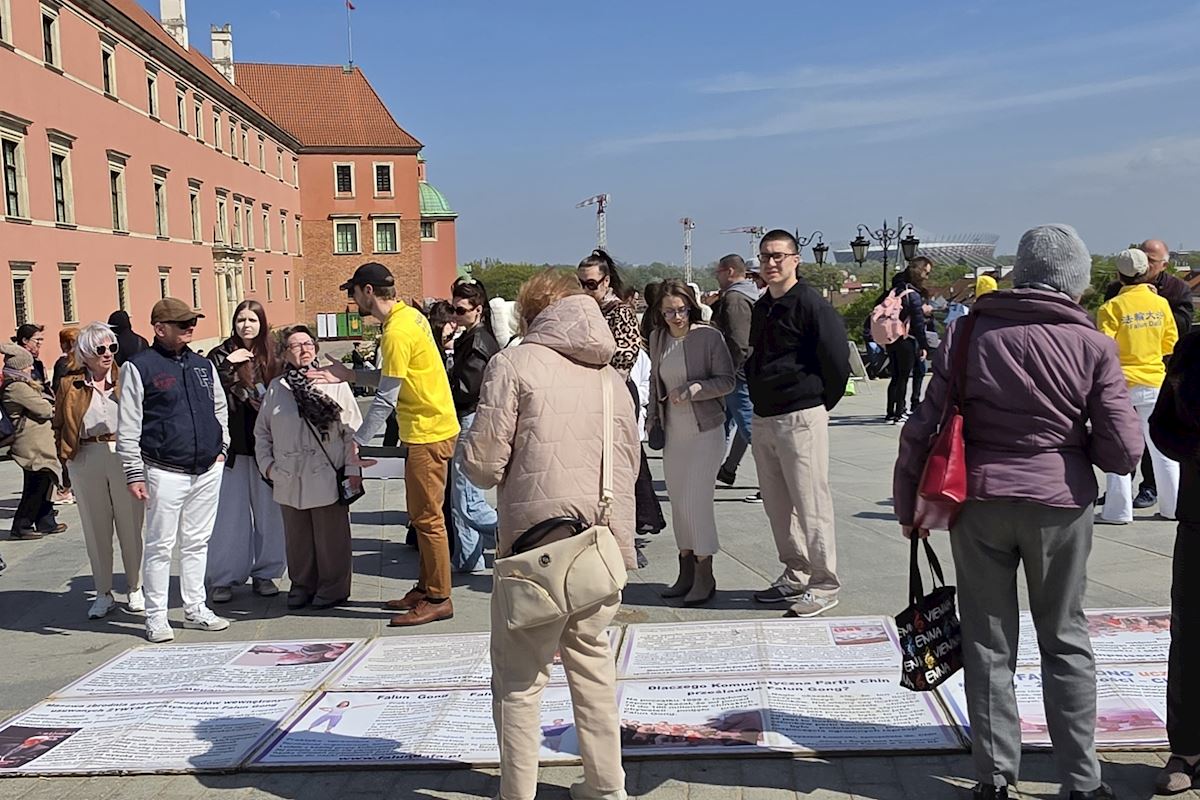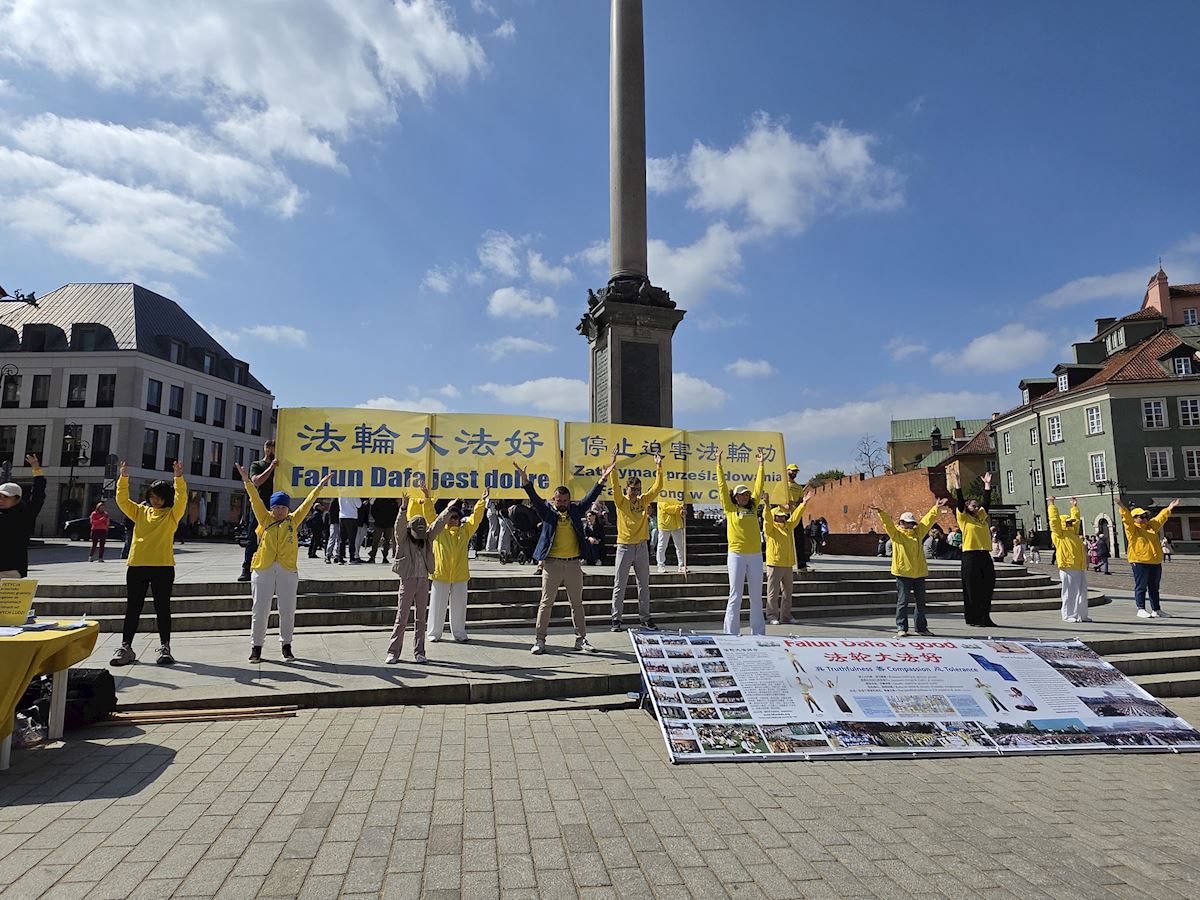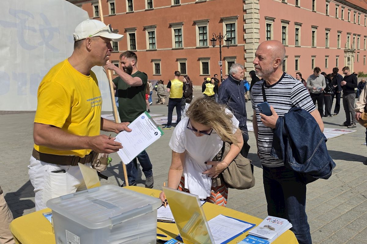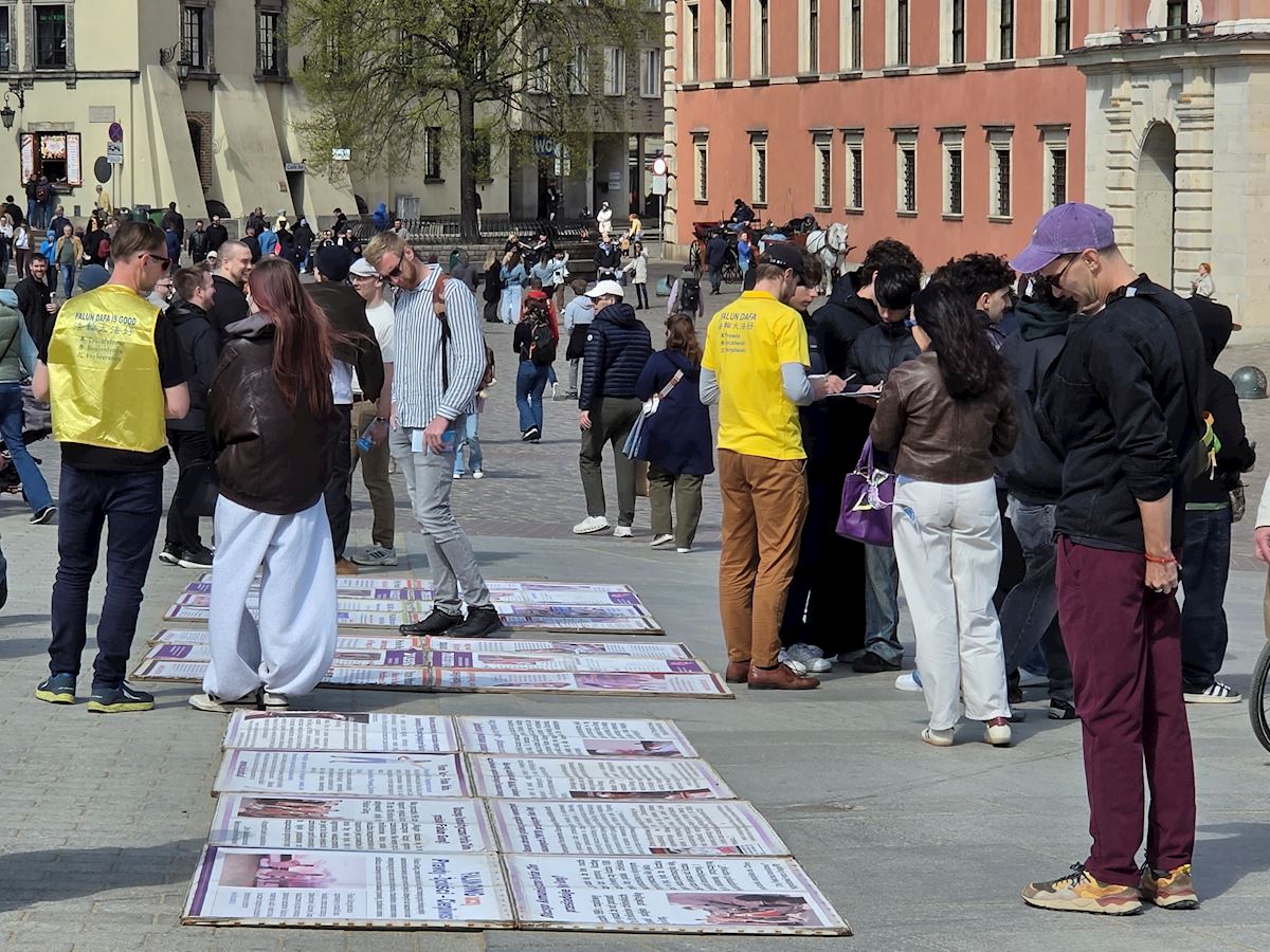 今年四月二十五日华沙古城广场和格但斯克长街广场上,法轮功展位在熙熙攘攘的人群中显得格外令人瞩目,慈悲的《普度》、《济世》乐曲,缓和的五套功法展示,整齐的炼功队伍及长长的真相展板,不断吸引路人驻足观看,拍照、学功、交谈,几乎所有前来了解法轮功真相的人都在停止迫害法轮功的征签簿上签上自己的名字。