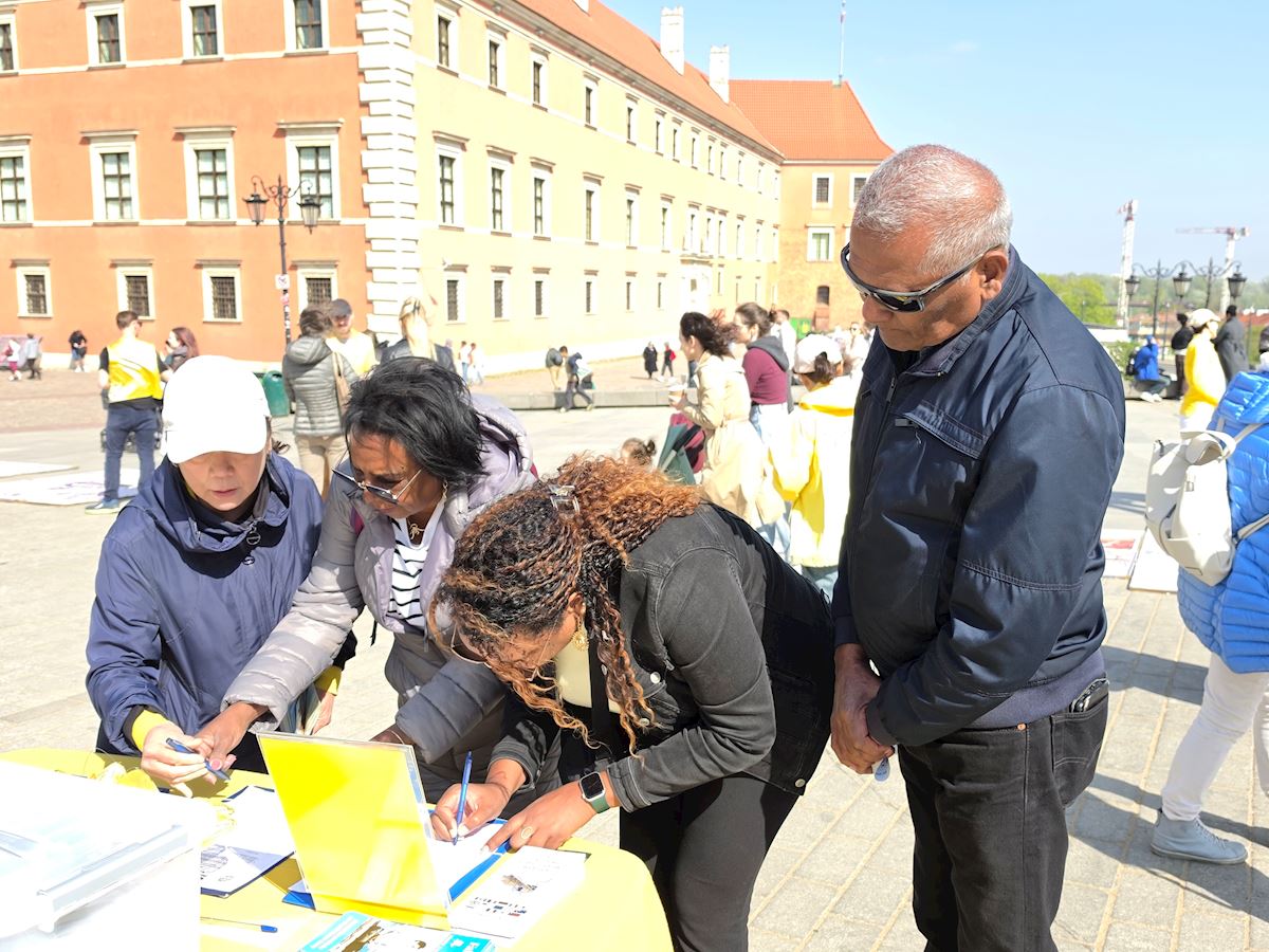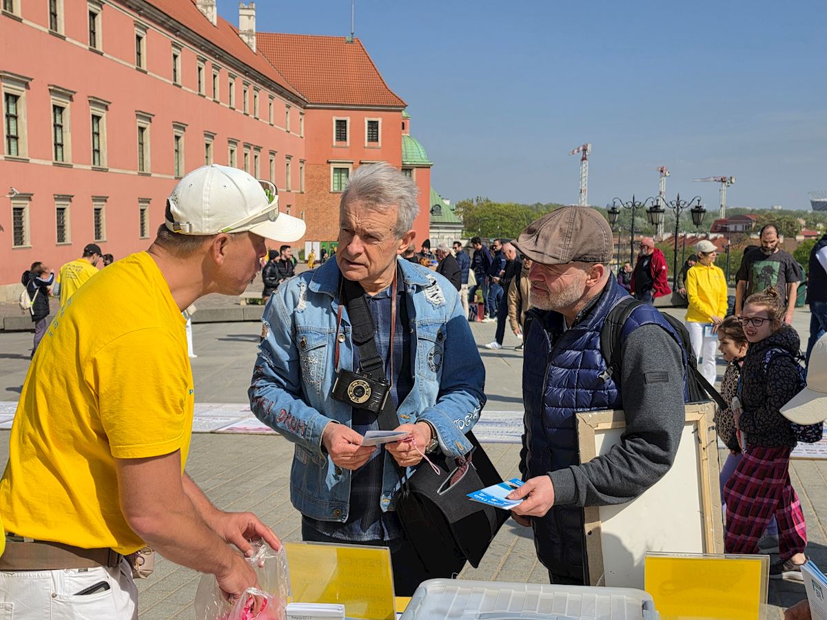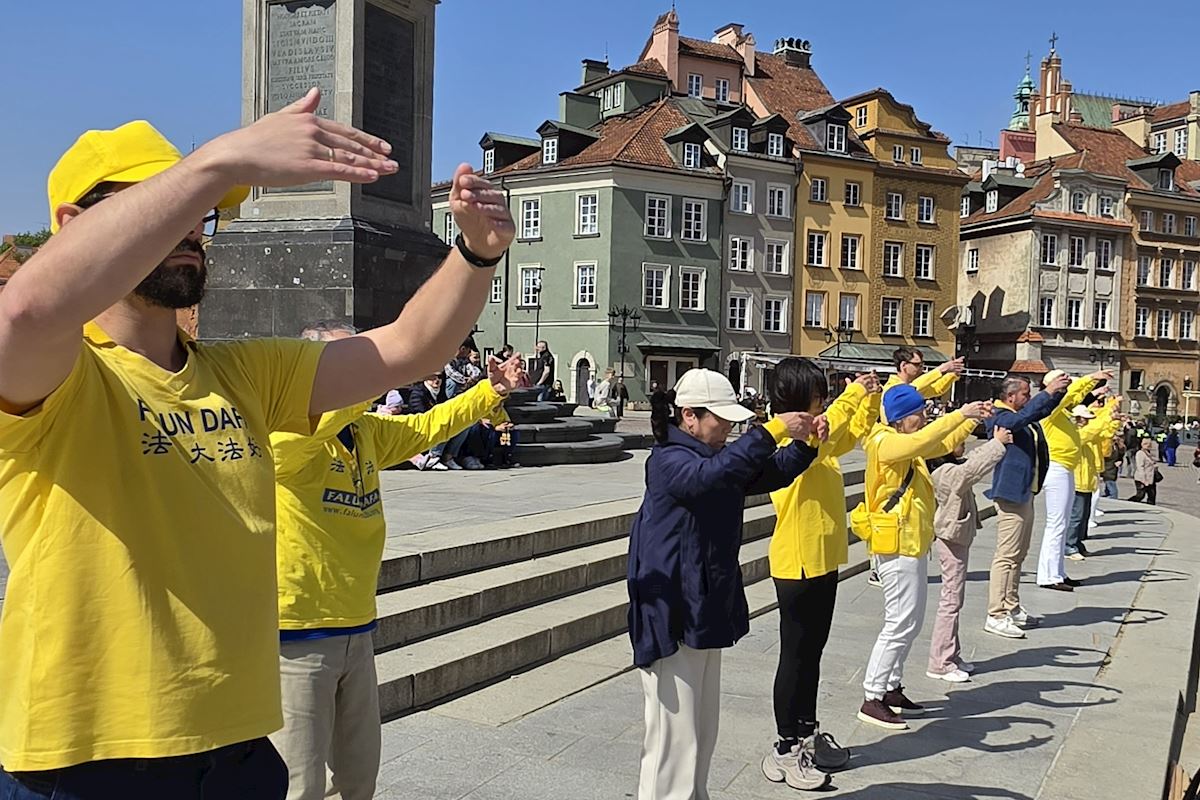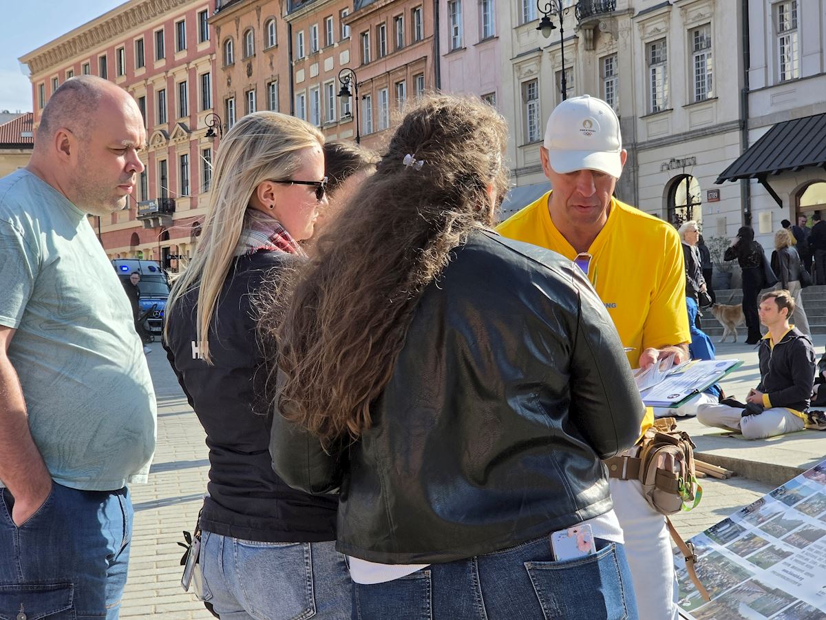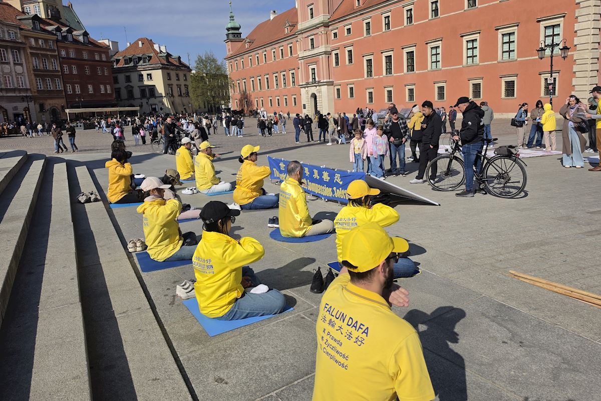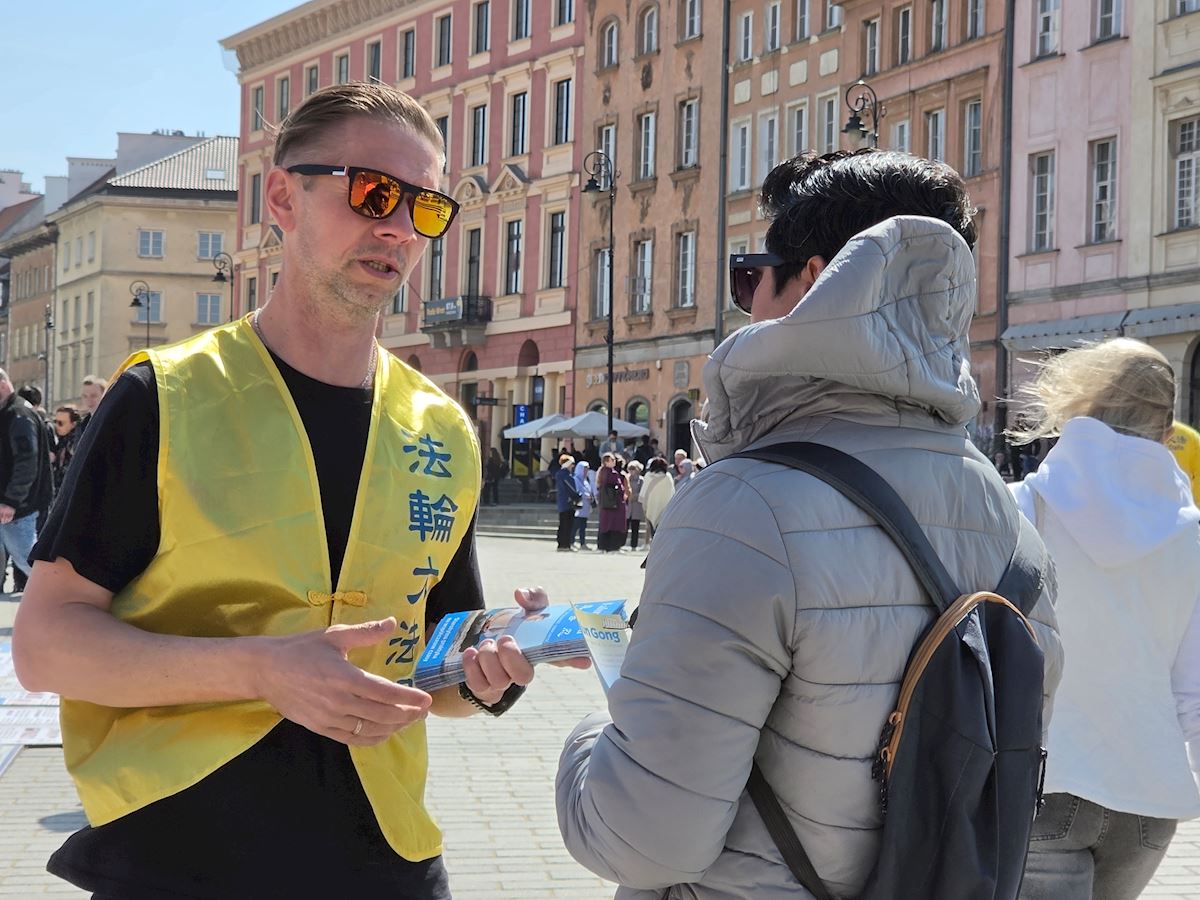 今年四月二十五日华沙古城广场和格但斯克长街广场上,法轮功展位在熙熙攘攘的人群中显得格外令人瞩目,慈悲的《普度》、《济世》乐曲,缓和的五套功法展示,整齐的炼功队伍及长长的真相展板,不断吸引路人驻足观看,拍照、学功、交谈,几乎所有前来了解法轮功真相的人都在停止迫害法轮功的征签簿上签上自己的名字。