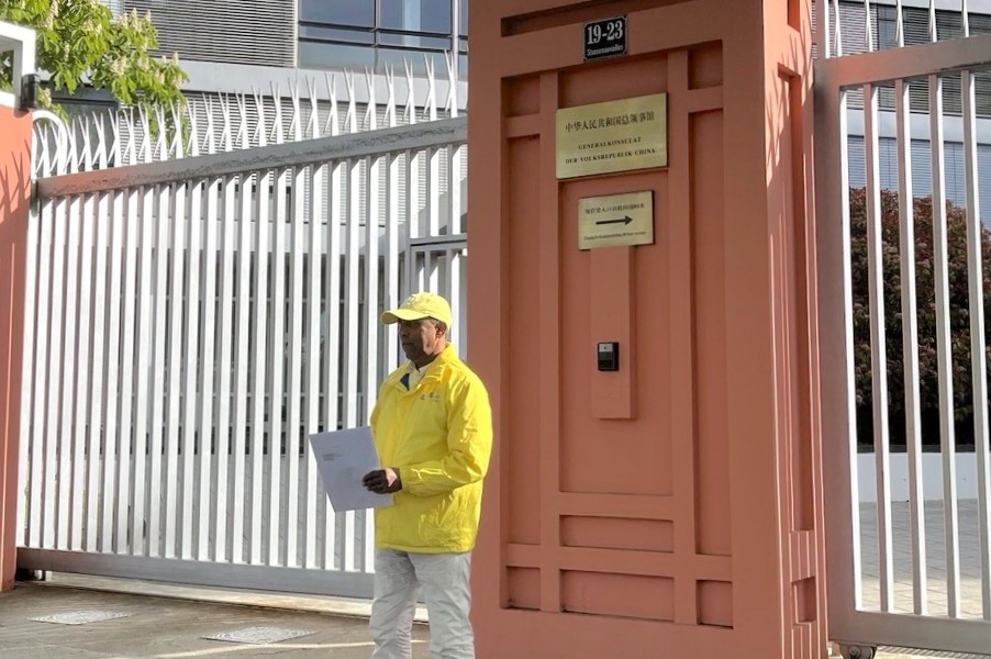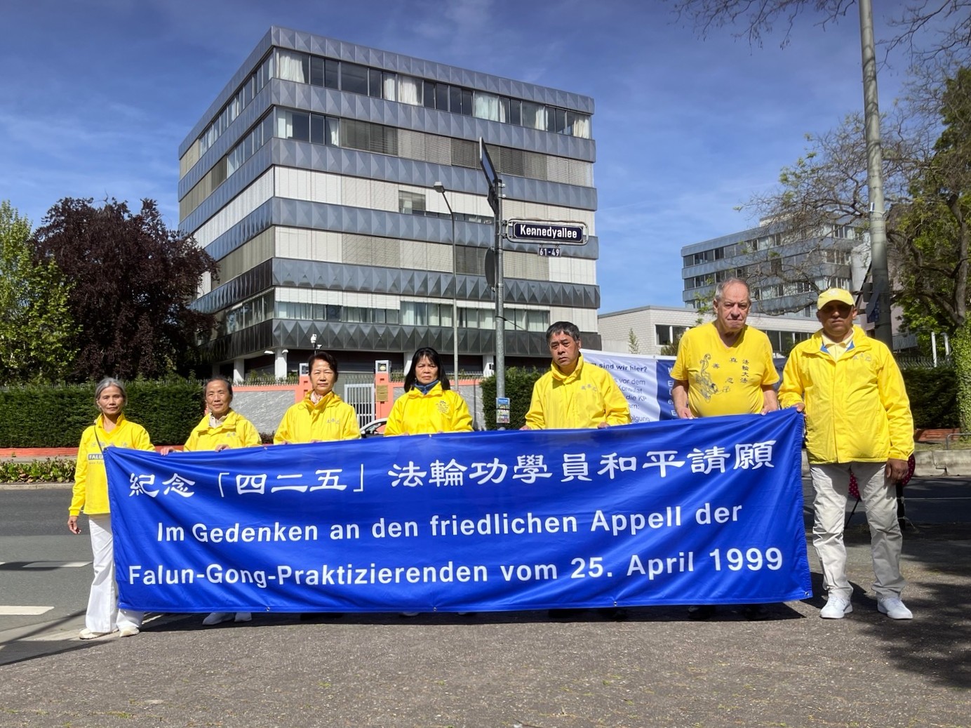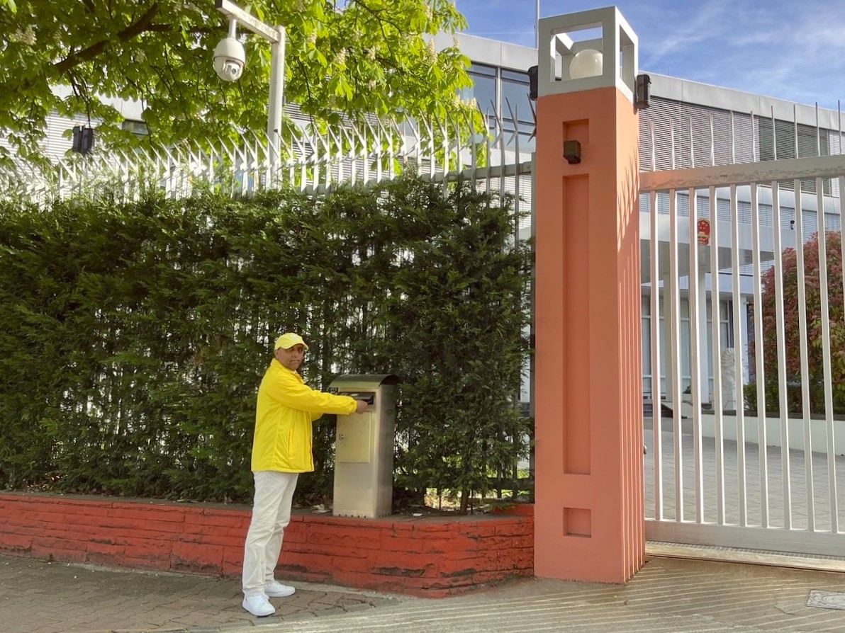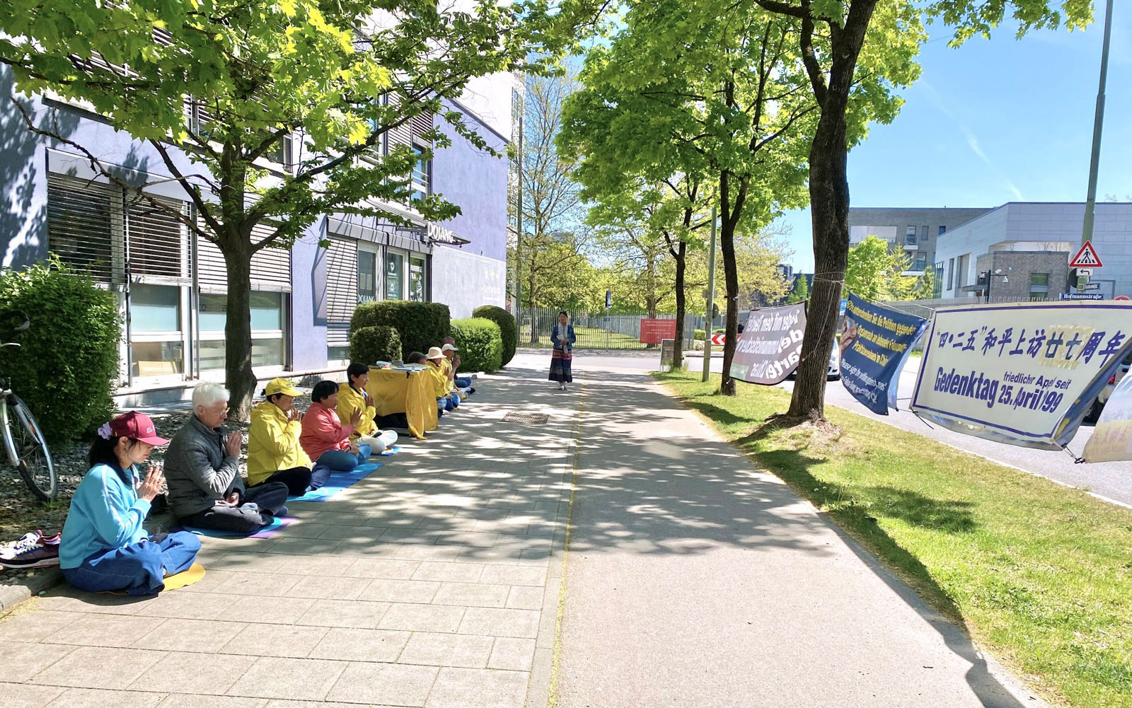 四月二十二日,部分北威州法轮功学员在杜塞尔多夫中领馆前举办活动,呼吁德国社会共同制止中共的迫害。期间,法轮功学员宣读了给中共领馆工作人员的劝善信。